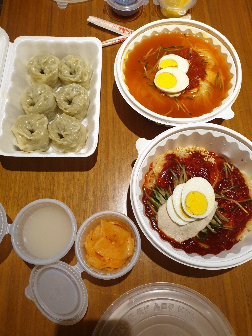 돌아가는 해변 열차에 인파가 몰렸다. 그때부터 피곤이 몰려들어 속이 계속 울렁거렸다. 숙소에 들어간 후, 남편은 부산에 오면 꼭 한번 먹어보고 싶었다며 나가서 밀면과 만두를 포장해 왔다. 5분 거린데도 이미 떡이 되어 있었다. 둘 다 한입씩 먹고 아무 말이 없었다. 나는 망한 것을 인정하고 싶지 않아서 '먹으면 먹을수록 맛있네~'하고 말했고, 남편은 자기 스타일이 아닌 것 같다고 단호한 의사표현을 했다. 솔직히 생각했던 맛은 아니었다.