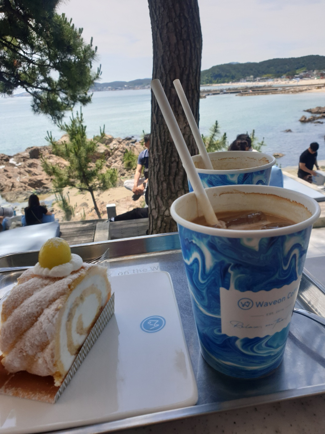 해변 열차를 타고 더운 날씨라 중간에 내리지 않고 마지막 정거장인 송정해변에 내렸다. 이곳은 망망대해가 펼쳐지는 동해바다 같지 않고, 산과 돌이 어우러져 더 다채롭다. 얼핏 제주바다 느낌도 난다. 반짝거리는 햇빛이 바다에 우수수 떨어져 윤슬을 이루었다. 처음 갔던 여수바다에서 반짝임에 눈부셔 저절로 마음에 시가 흘러넘쳤던 기억이 되살아났다. 해변 앞 작은 언덕과 정자에 올라 사진을 찍고 내려와서 '가베원'이라는 카페에 갔다. 해변 중앙의 카페보다 조용하고 분위기도 좋고 커피도 맛있었다.