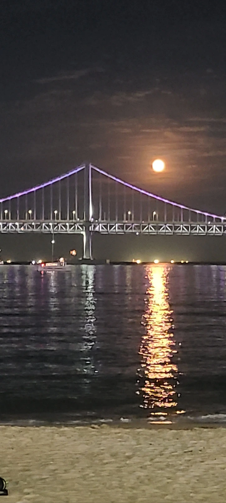 밤문화를 즐기고 싶단 남편의 성화에 숙소에 들어갔다가 다시 나와 캔맥주와 새우깡을 사들고 해안가 계단에 자리 잡았다. 가까이에 캐리커쳐를 그려주는 거리의 예술가가 있고 노래 버스킹을 하는 청년도 있었다. 광안대교 뒤로 노랗고 둥그런 뭔가가 보였다.