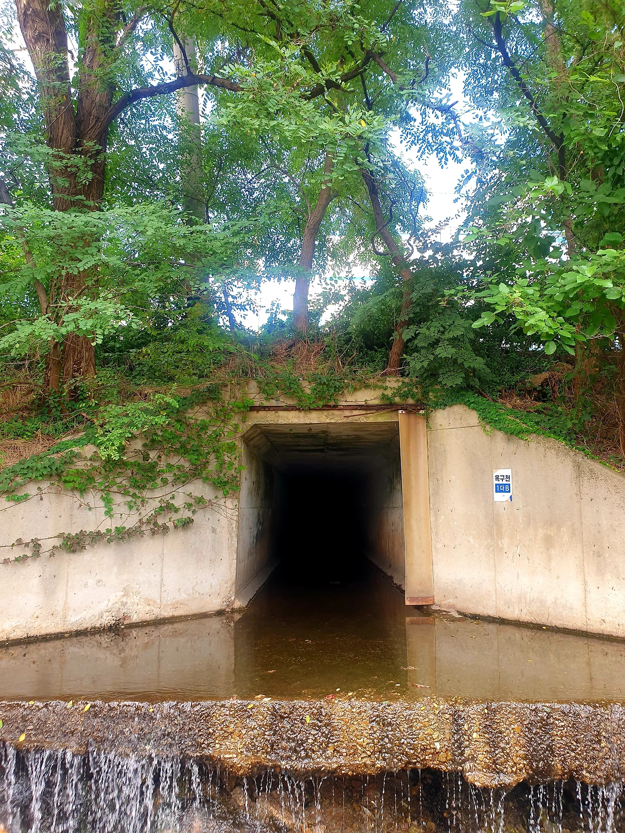 길목 오른편에 하수구 터널이 있다. 갑자기 쥐가 튀어나올 것 같기도 하고 가만히 안을 들여다보면 어둠속으로 빨려 들어갈 것만 같다. 그러나 몇 발짝만 떨어져서 보면, 콸콸 흐르는 물이 보기에도 시원하고 싱그러운 초록 풀사이로 비치는 햇살은 눈부시다.귀여운 참새도 나무에 날아와 앉아 정겹게 지저귄다.