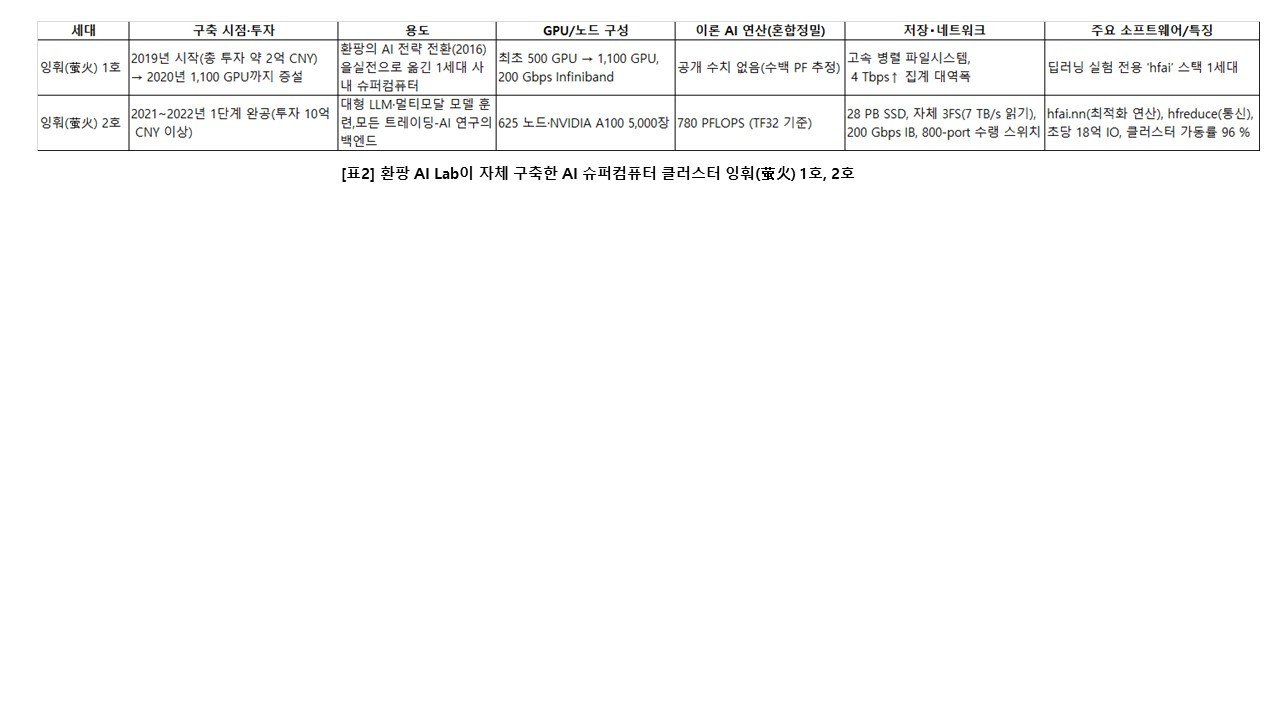 4. AI 슈퍼컴퓨터 클러스터의 코드네임인 '잉훠(萤火)'를 보면서 확신이 들었다. 량원펑이 와이프와 회사 사람들이 여러번 GPU장비를 대규모로 구매하는것에 많은 반대를 했는데도 량원펑은 군비경쟁에서 사실상 중국에서 웬만한 빅테크 회사를 능가하는 규모로 GPU를 사들였다. 퀀트투자를 하기 위해 GPU를 확보한 것이 결국 확장되어 딥시크(DeekSeek)라는 회사가 만들어졌으니 이 세계는 결국 ‘장비’와 ‘데이터’의 싸움에서 이긴것이 된다.(실제 데이터 부분에서는 확인을 못했지만 중국의 경우 다른 선진국보다는 증시의 복잡도가 낮아 가격이나 거래량과 같은 지표로만으로도 어느정도 승산이 있었다고 한다. 아마도 GPU를 통한 알고리즘 수치 연산과 고빈도(HFT) 매매가 동시에 이루어질 것으로 추정된다.)