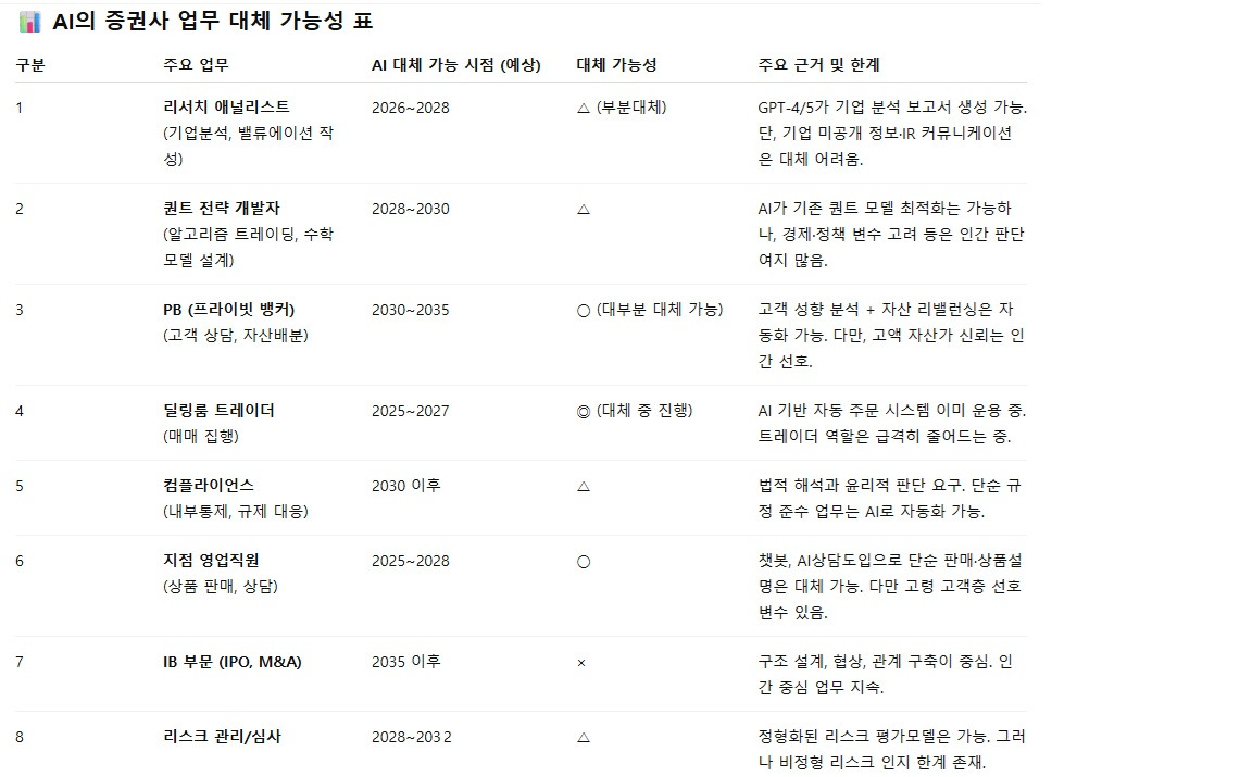 [표] A.I의 증권사 업무 대체 가능성 표(대체가능시점, 가능성, 근거 및 한계)