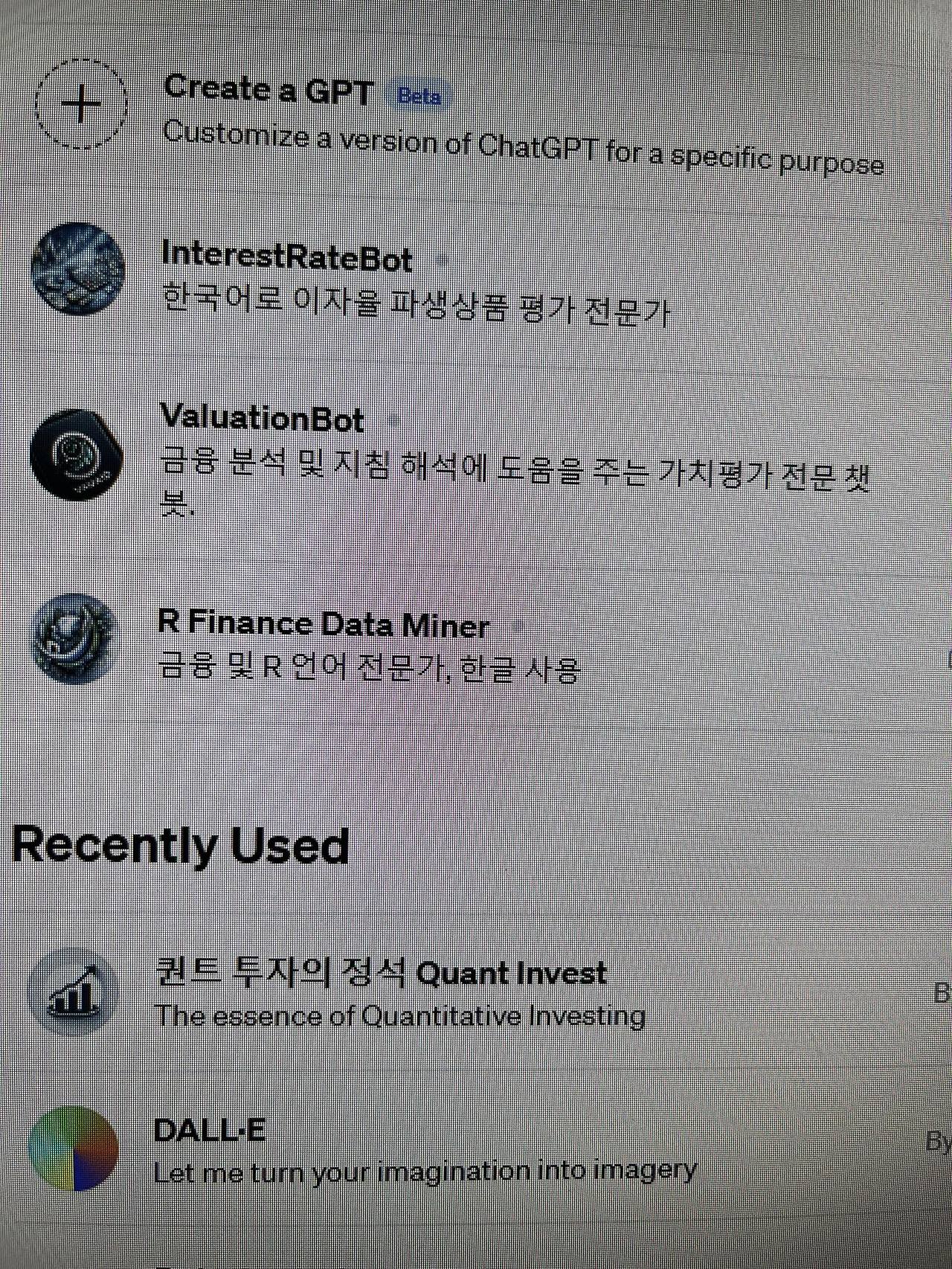 금주에 개인적으로 왼쪽의 그림에서 보듯이 이자율파생 평가봇, Valuation봇, R 금융분석 봇을 만들어 보았다. GPTs는 본인의 자료로 생성한다고 하더라도 보안, 정보노출, 저작권 문제가 있어 공개에 조심스럽다. 그래도, 좋은 GPTs가 유료, 무료로 많이 제공될것이다. 아래에 공개된 GPTs를 몇가지 추려보았다. 유료 계정이 있는 경우 게시물의 visit을 누르면 바로 사용가능하다. 기존 무료 및 유료 챗GPT보다 자신의 자료로 좀 더 파인튜닝(Fine tuning)된 답변이 나온다는 것을 알 수 있다. AGI 이야기가 솔솔 들리고 있는 OpenAI의 다음 전략이 기대된다.
