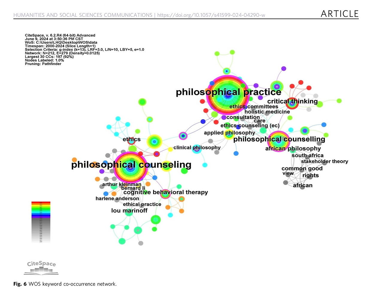 이 논문에 제시된 Fig. 6의 WOS 키워드 동시출현 네트워크는 철학상담과 철학적 실천이 어떻게 인지행동치료(CBT), 윤리학, 비판적 사고, 공익의 추구와 맞물려 있는지를 시각적으로 보여준다.