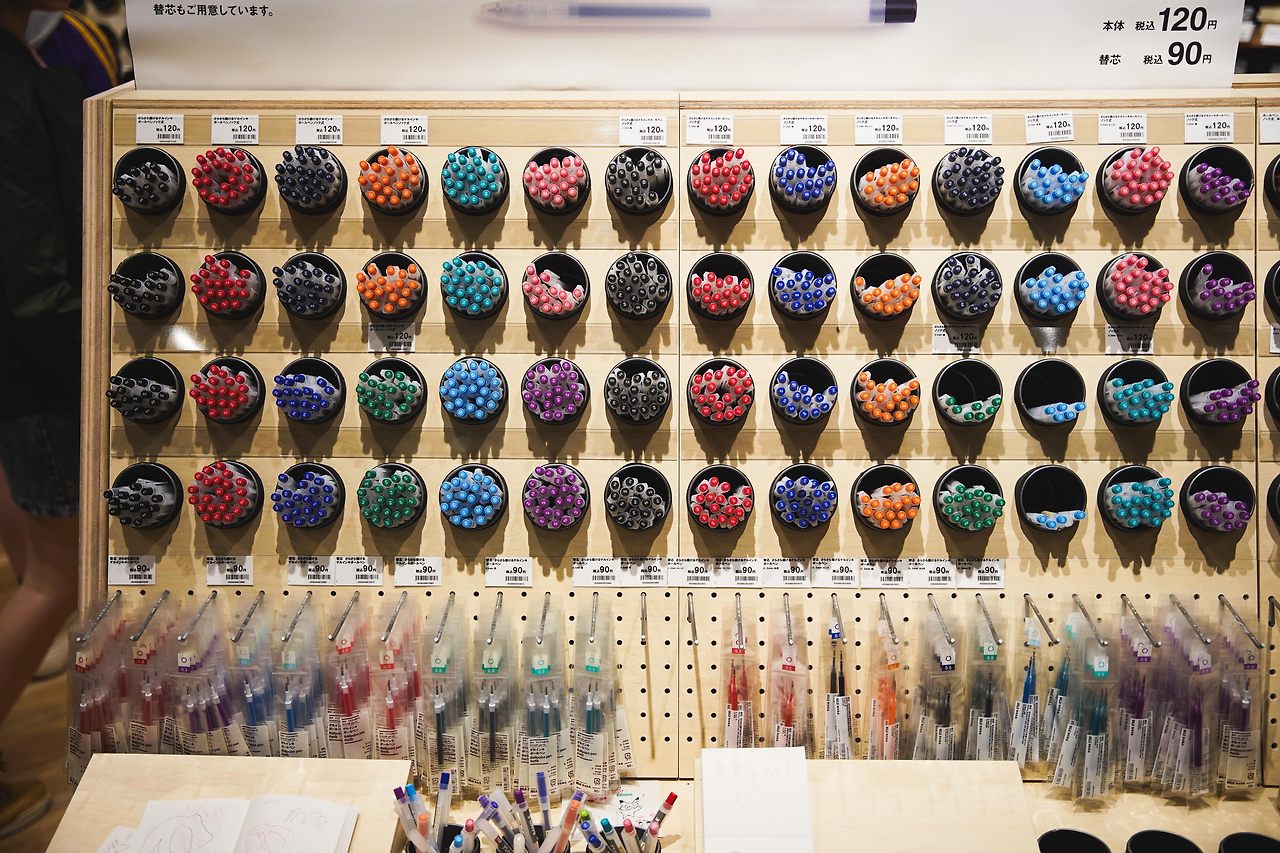 필기구의 디스플레이가 특히 마음에 들었다. 색상이 잘 보이게끔 원형 통에 잘 정리된 모습이다.