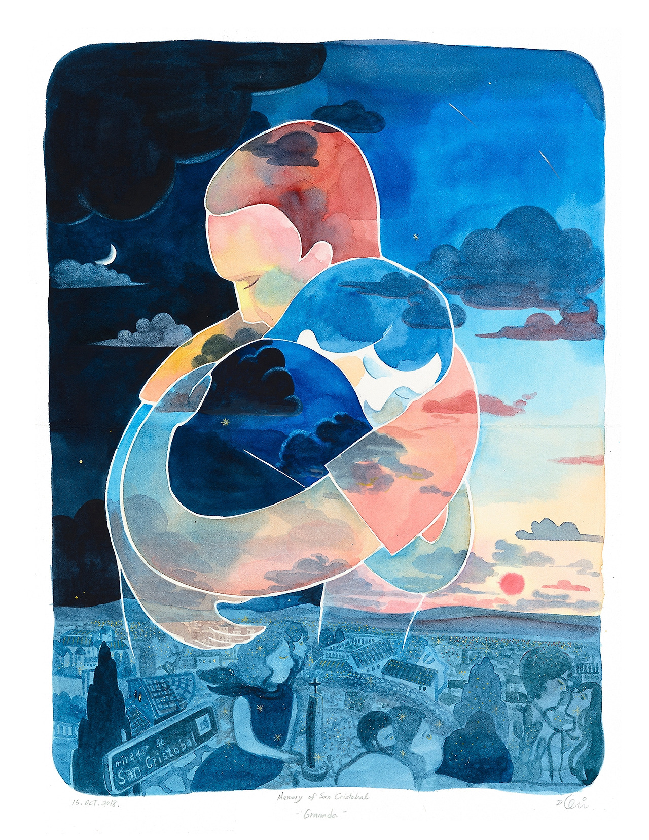 그렇게 그림을 구상하기 시작했습니다. 매일 올랐던 산 크리스토발의 풍경과, 닿지 않을 듯 서로 닿아있던 태양과 달의 모습, 평야에서 점점히 빛나던 도시의 모습과 함께 그저 머무는 것 만으로 행복할 수 있었던 그라나다와의 포옹을 하나의 그림에 담아내고 싶었어요. 그리고 완성된 그림은 '그라나다와의 작별'이란 이름이었다가, 곧 'Good morning, Good night'이란 이름을 가지게 되었습니다.