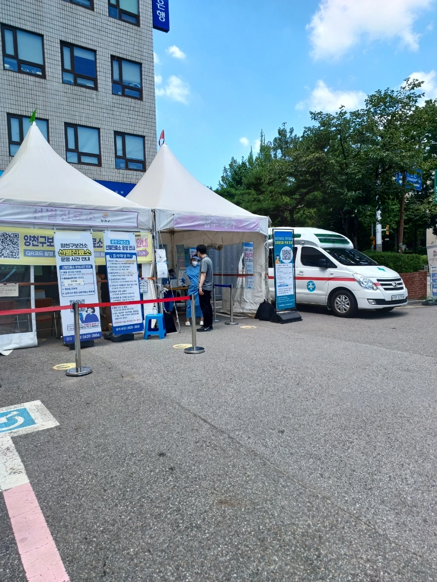 한참을 걸어 양천구청 앞에서 신호등을 다시 한번 건너고 양천구청 현관문을 지나 긴 통로 끝에 있는 양천 보건소 건물에 당도했다. 보건소 주차장에 코로나 간이 검사소가 늘어서 있다. 이 간이 검사소 뒤에 있는 건물 1층이 바로 은행 지점이다.