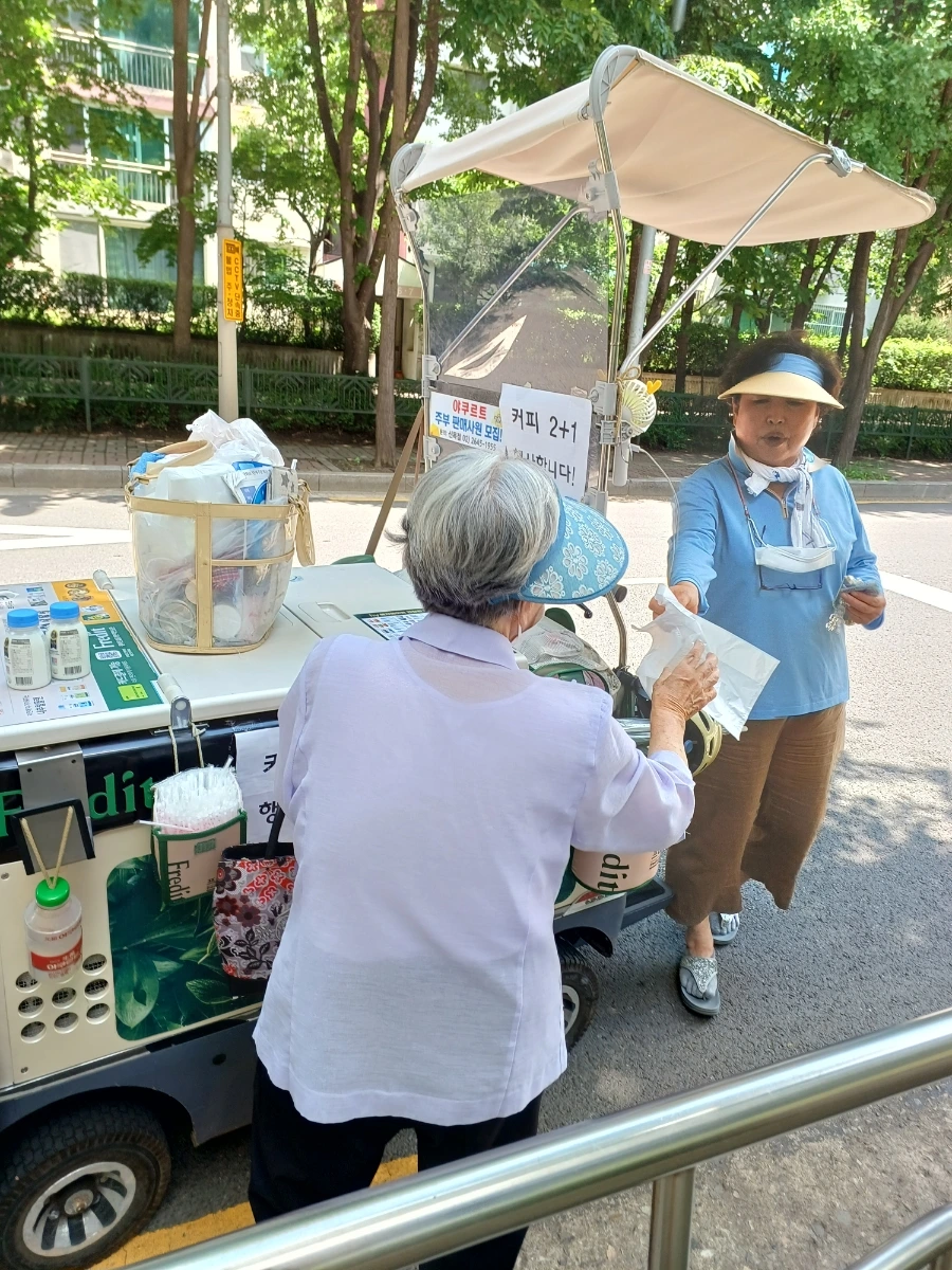 점심시간은 훌쩍 지난 뒤였다. 할머니에게 무엇을 좀 드실 거냐고 여쭤보니 치아가 안 좋아 드시지 못한단다. 그때 요구르트 아주머니 전동차가 보인다. 할머니가 서둘러 요구르트 아주머니를 불러 세운다. 그러더니 우유를 구매하신다.