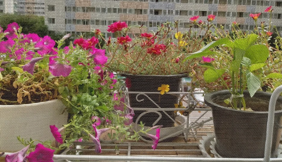 베란다 방충망 너머로 보이는 채송화