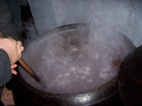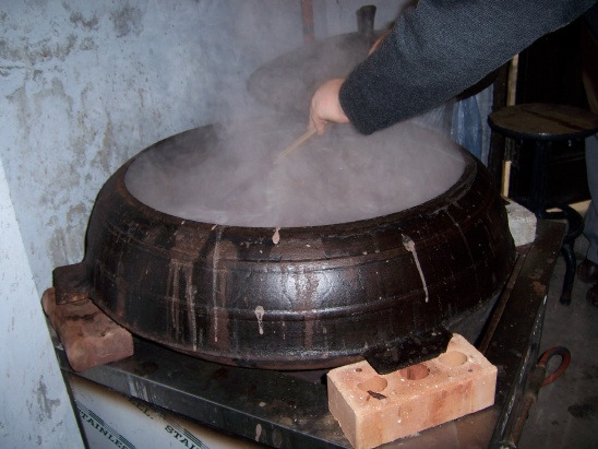 커다란 가마솥에 체에 곱게 내린 팥물을 넣고 커다란 나무 주걱으로 눋지 않게 젓고 있습니다.