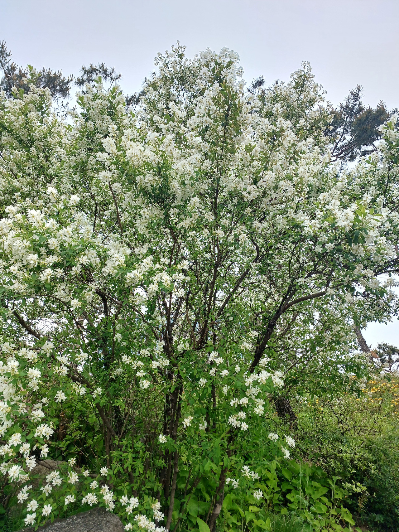 꽃이 흐드러지게 핀 나무 앞에서