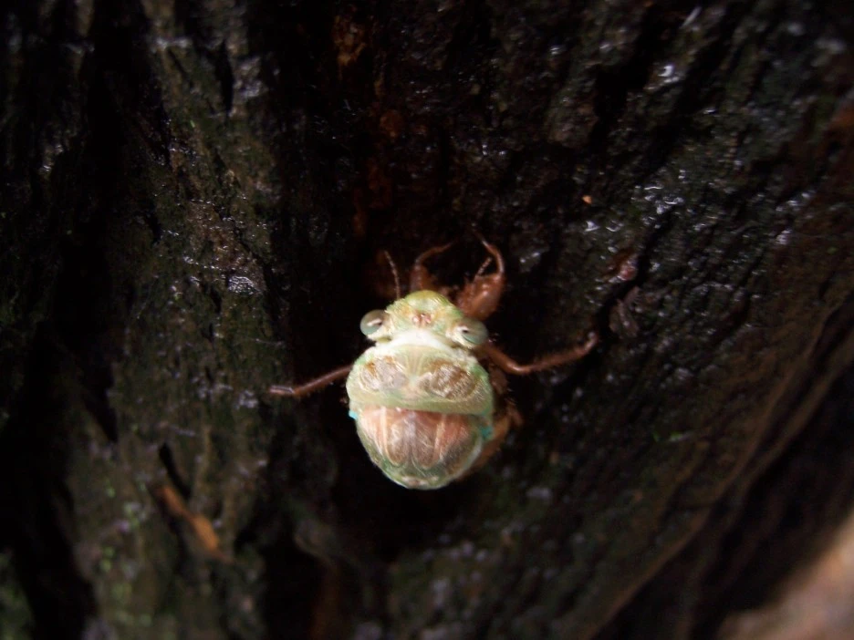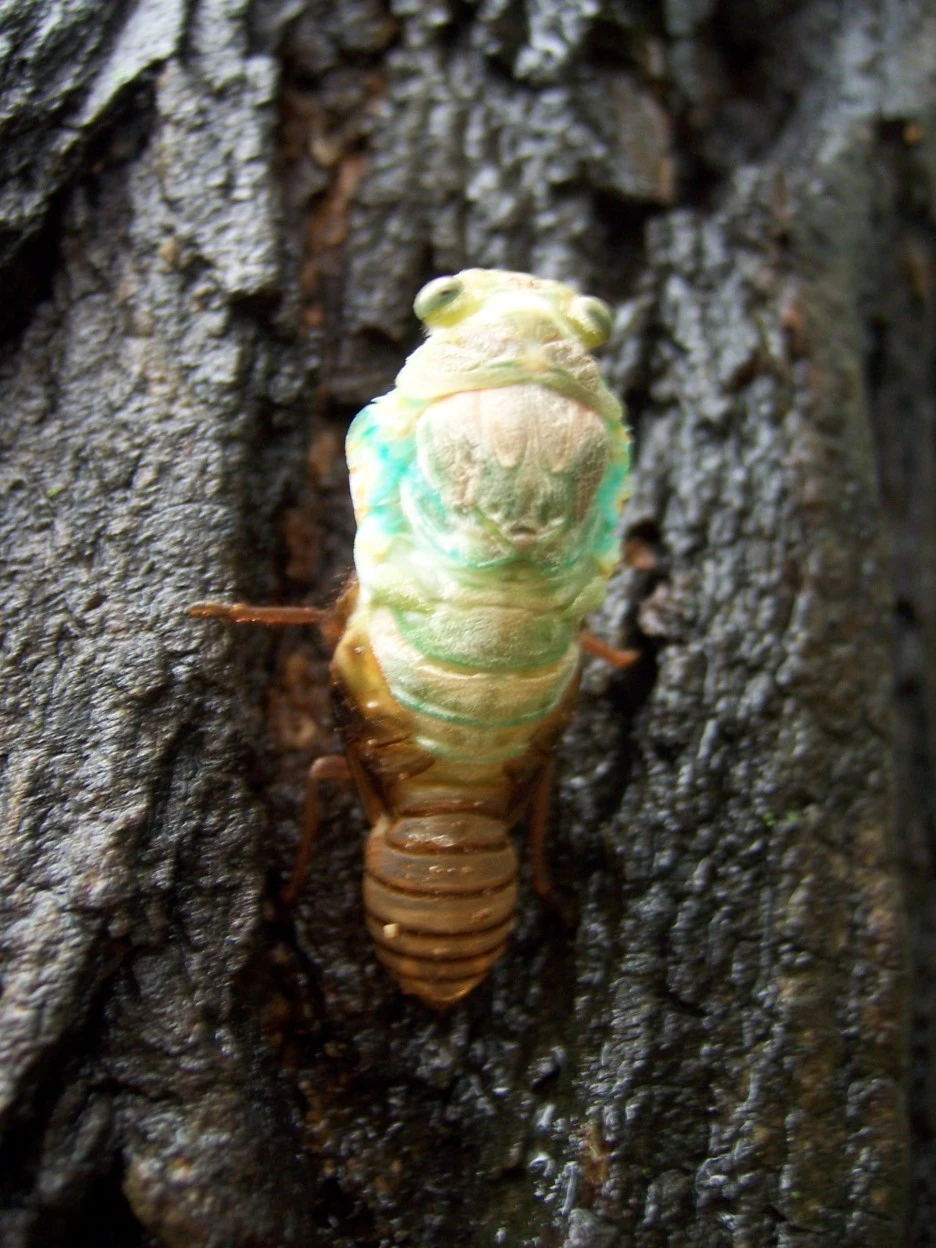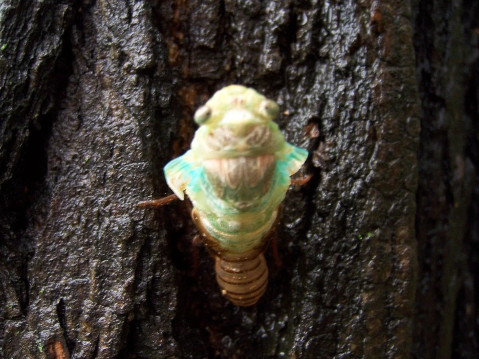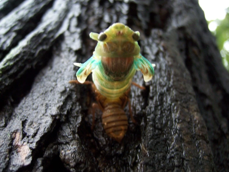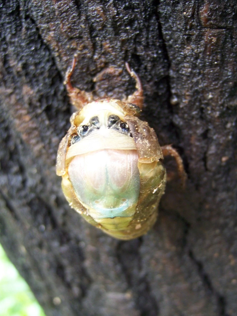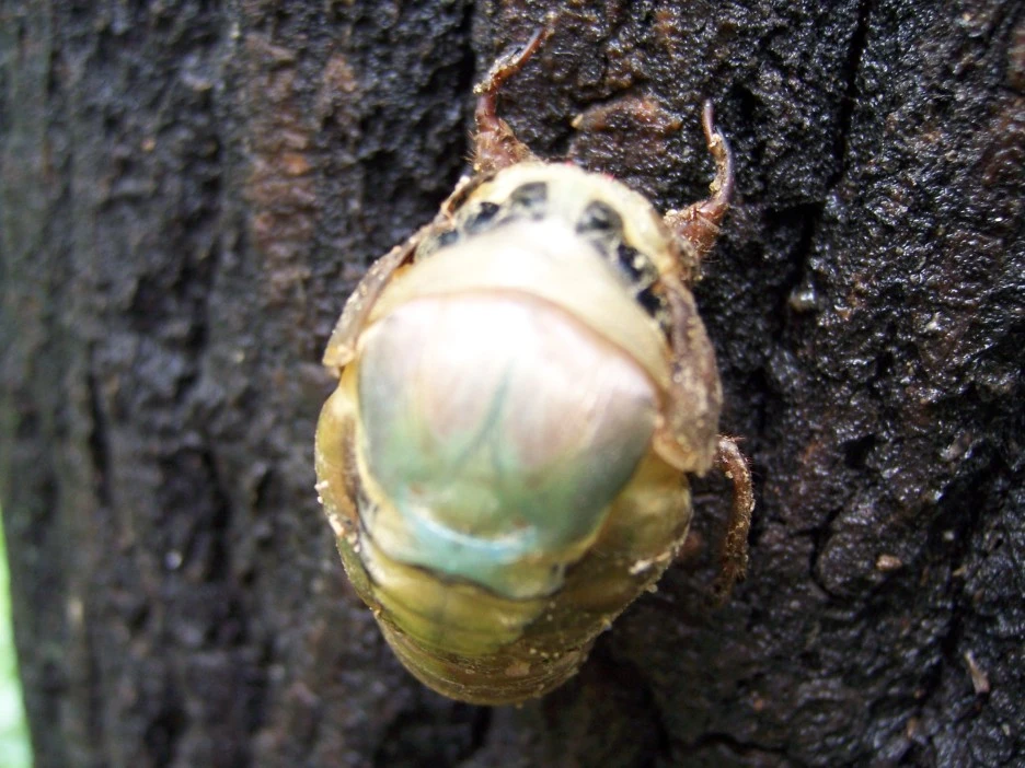 25분이 지났을 즈음 드디어 파르스름한 매미 머리가 껍질 밖으로 쑥 나왔다.