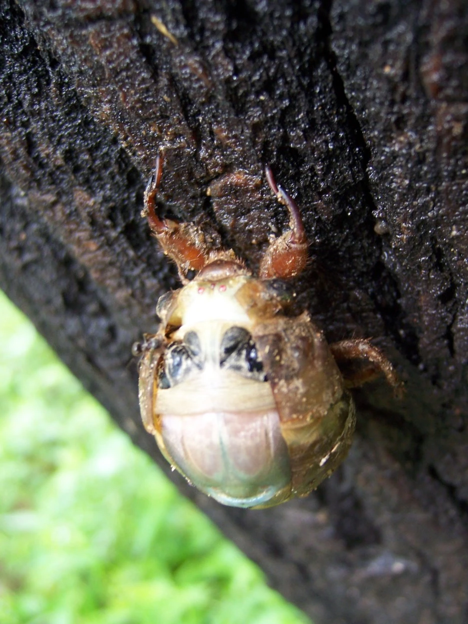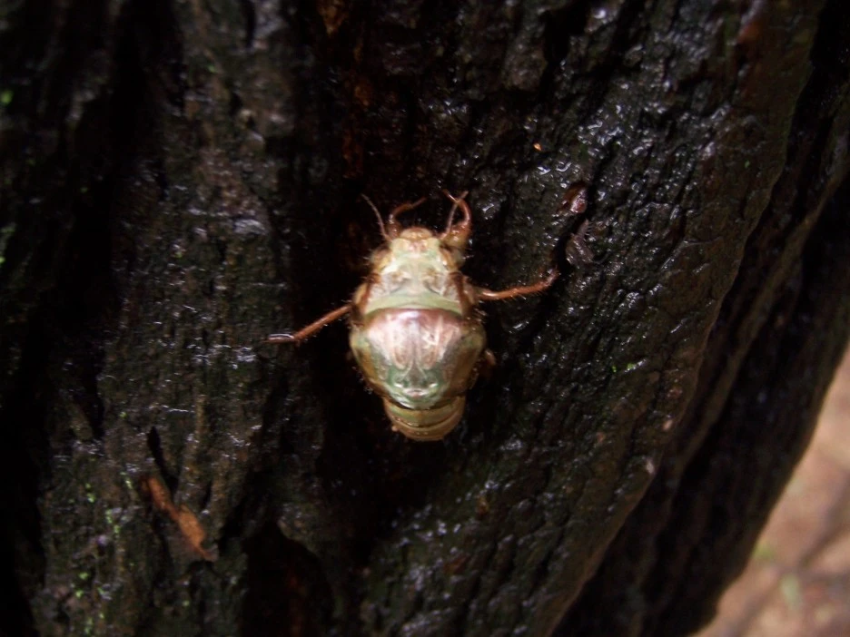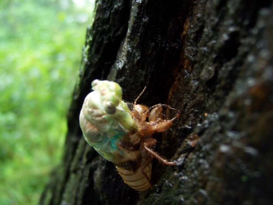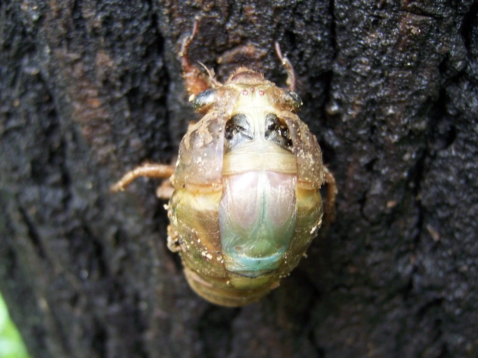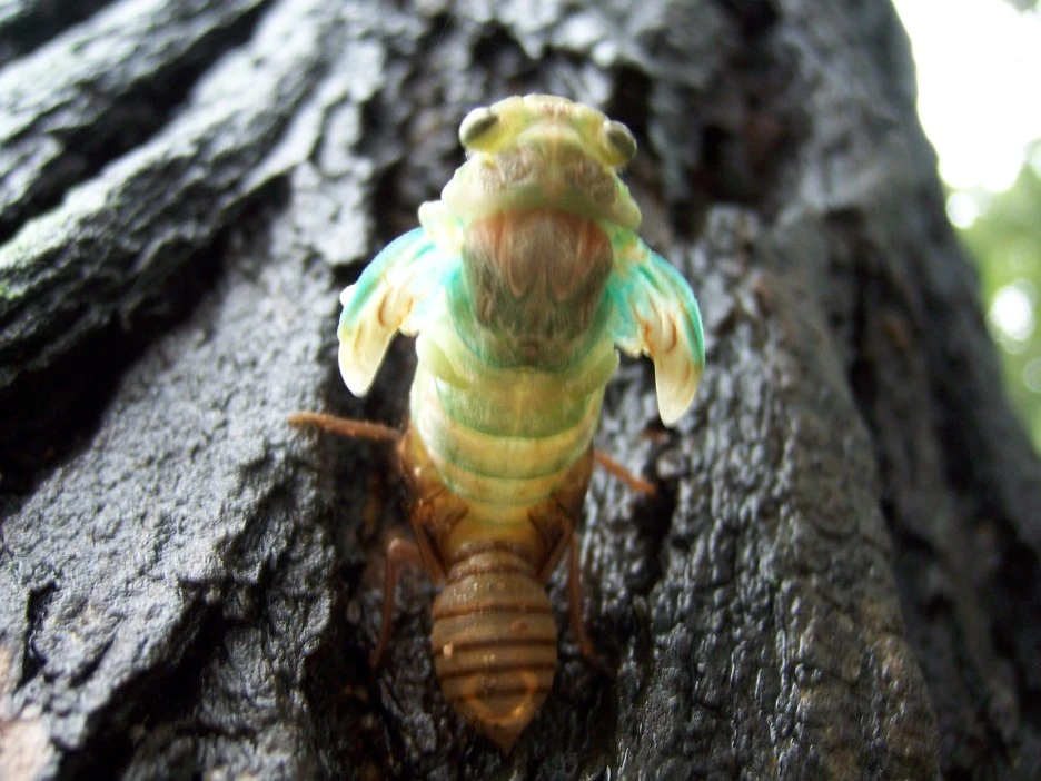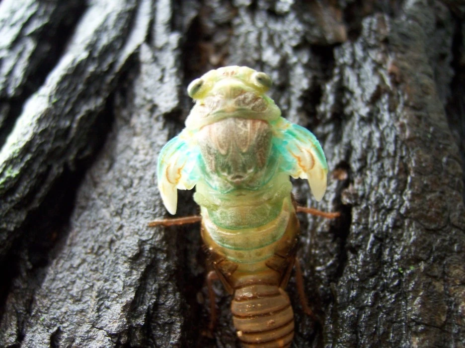 25분이 지났을 즈음 드디어 파르스름한 매미 머리가 껍질 밖으로 쑥 나왔다.