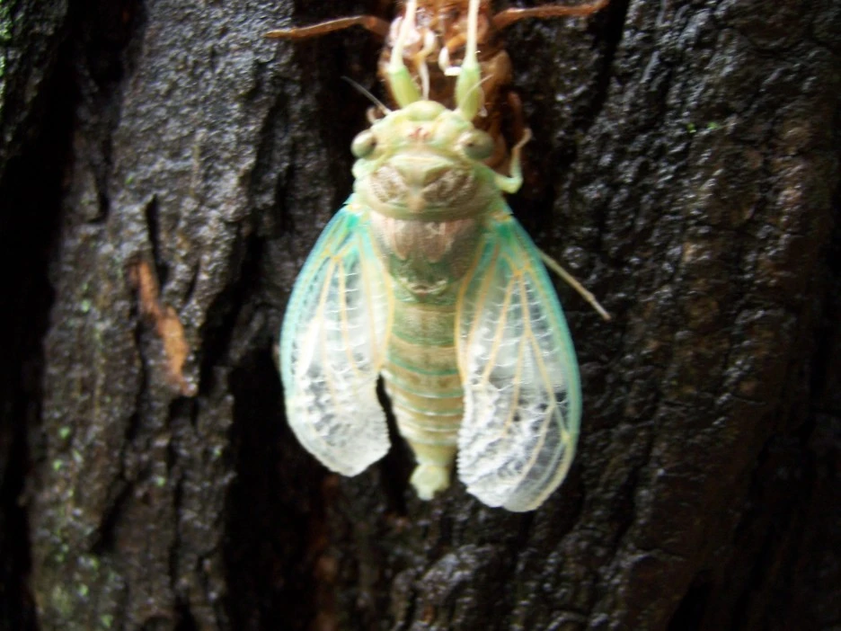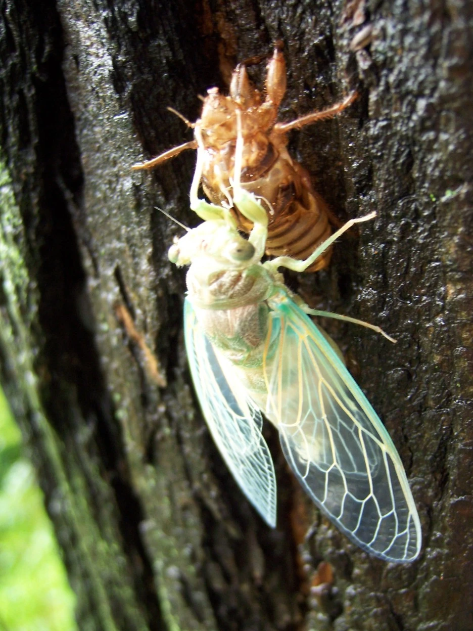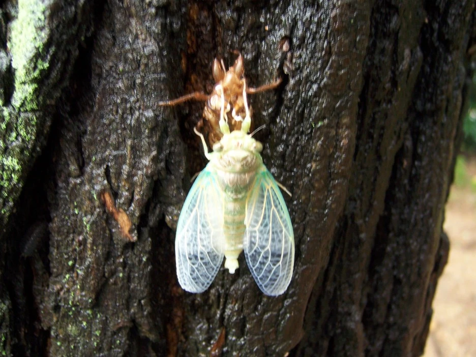 껍질을 붙잡고 완전한 형태의 매미로 환골탈태한 매미는 오른쪽 사진처럼 껍질에서 떨어져 젖은 날개를 말린다.