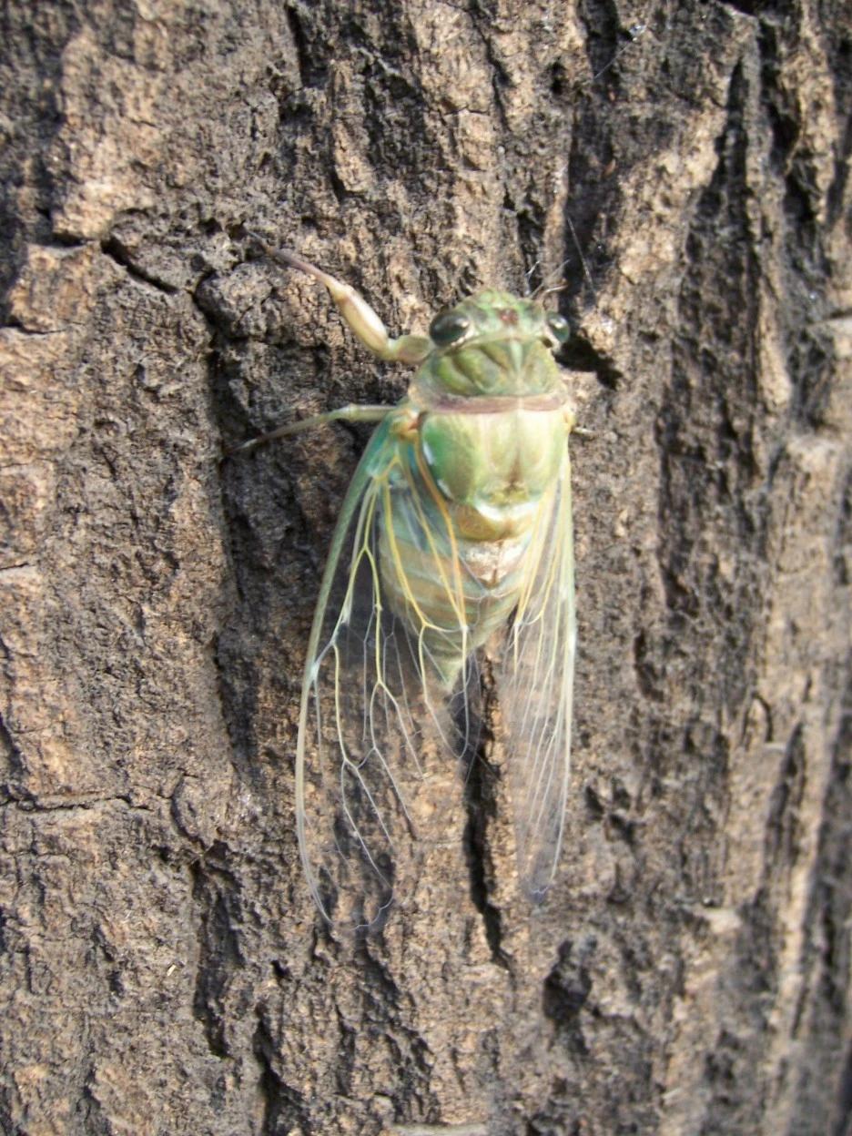 막 껍질을 벗은 매미들이 날개를 말리면서 숨 고르기를 하고 있다.