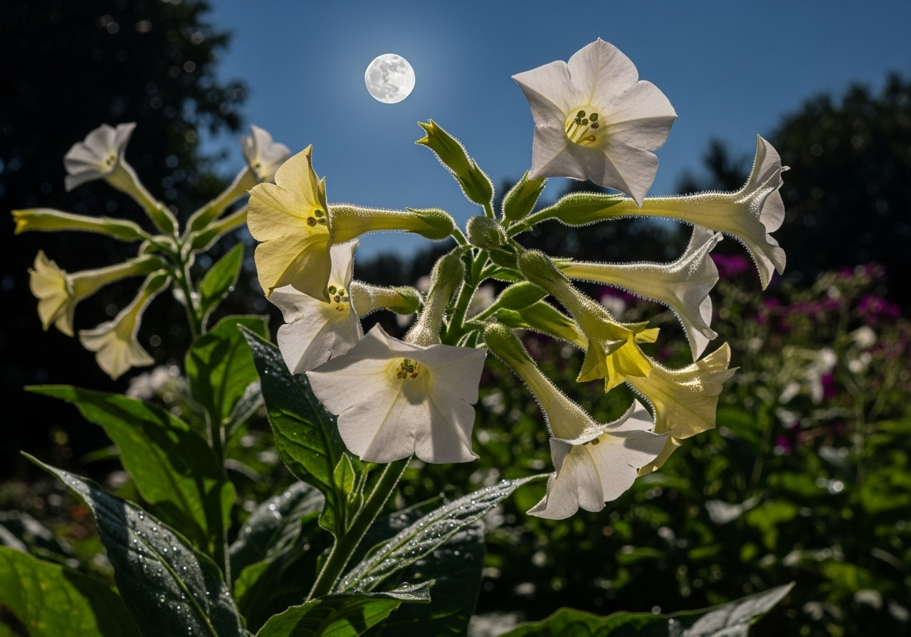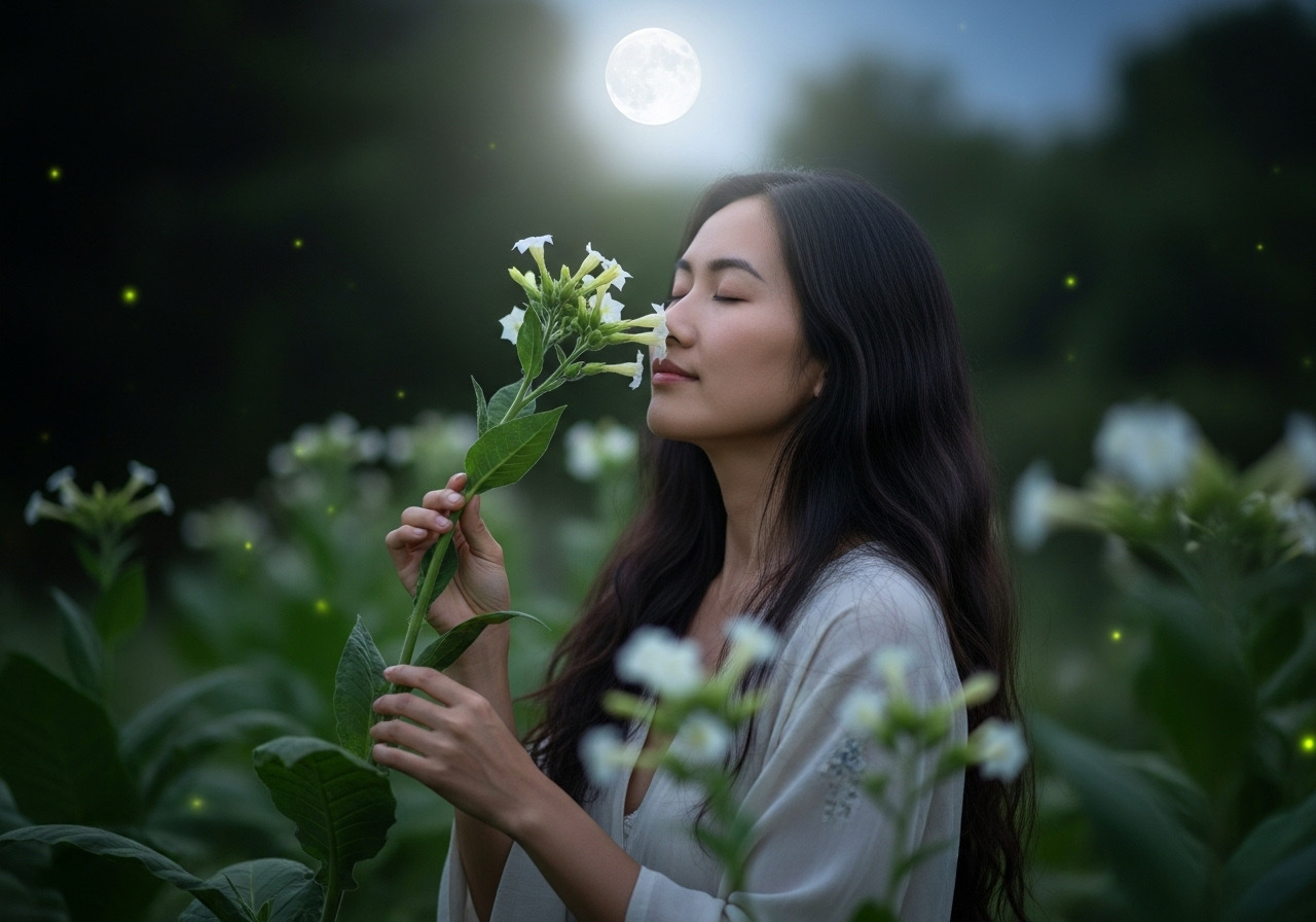 나는 낮에는 조용히 숨어 지내다, 해가 지고 달빛이 내릴 때 비로소 내 모습을 드러내는 꽃, 꽃담배입니다. 사람들은 나를 밤의 여왕이라 부르지요.