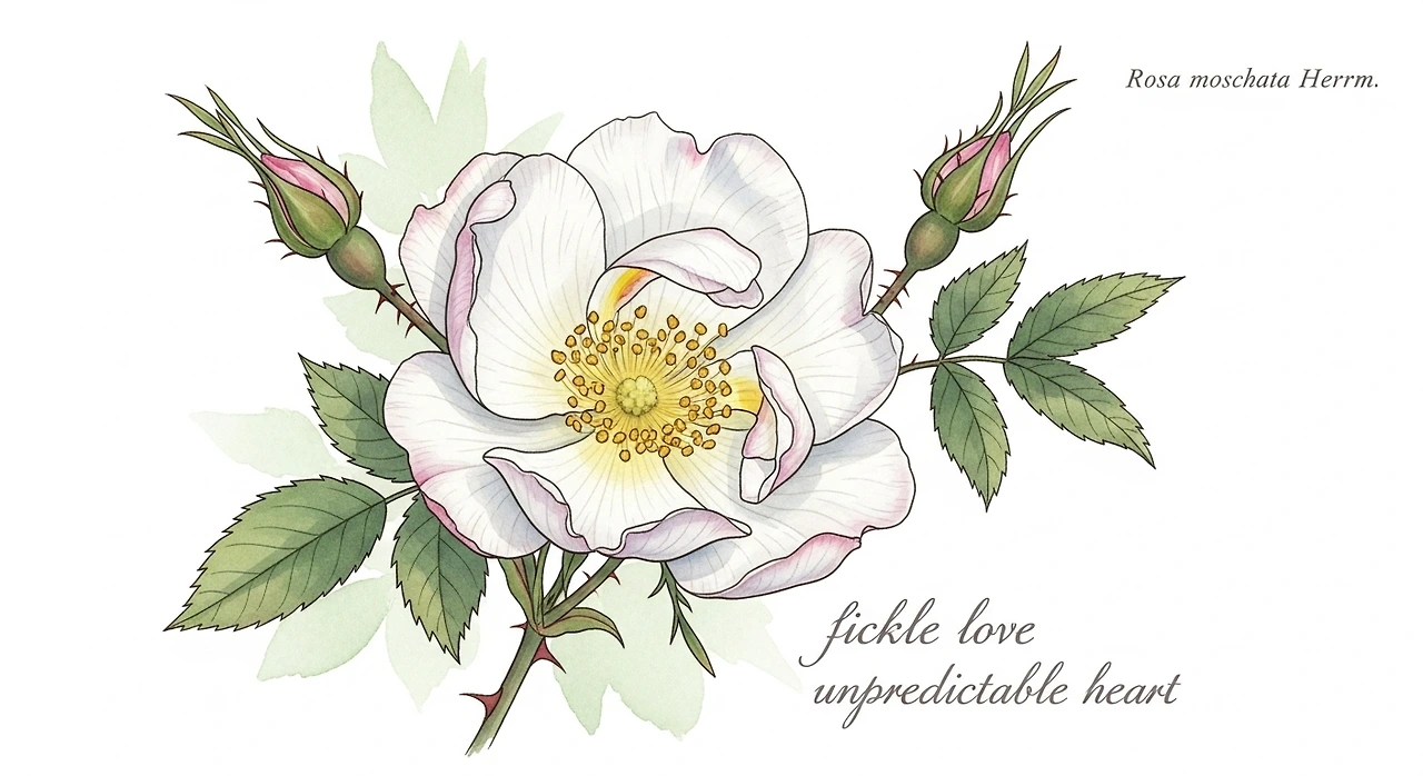 사향장미의 꽃말은 ‘변덕스런 사랑’, ‘예측할 수 없는 마음’이다. 하얀 꽃잎은 순수함을 상징하지만, 그 향기에는 인간의 복잡한 감정이 섞여 있다. 사랑은 언제나 일정하지 않다. 기쁨과 서운함, 열정과 냉정이 교차하며, 우리는 그 안에서 조금씩 성숙해진다. 사향장미의 향기도 그처럼 단순하지 않다. 은근히 번져나가며, 때로는 따뜻하게, 때로는 아릿하게 남는다.