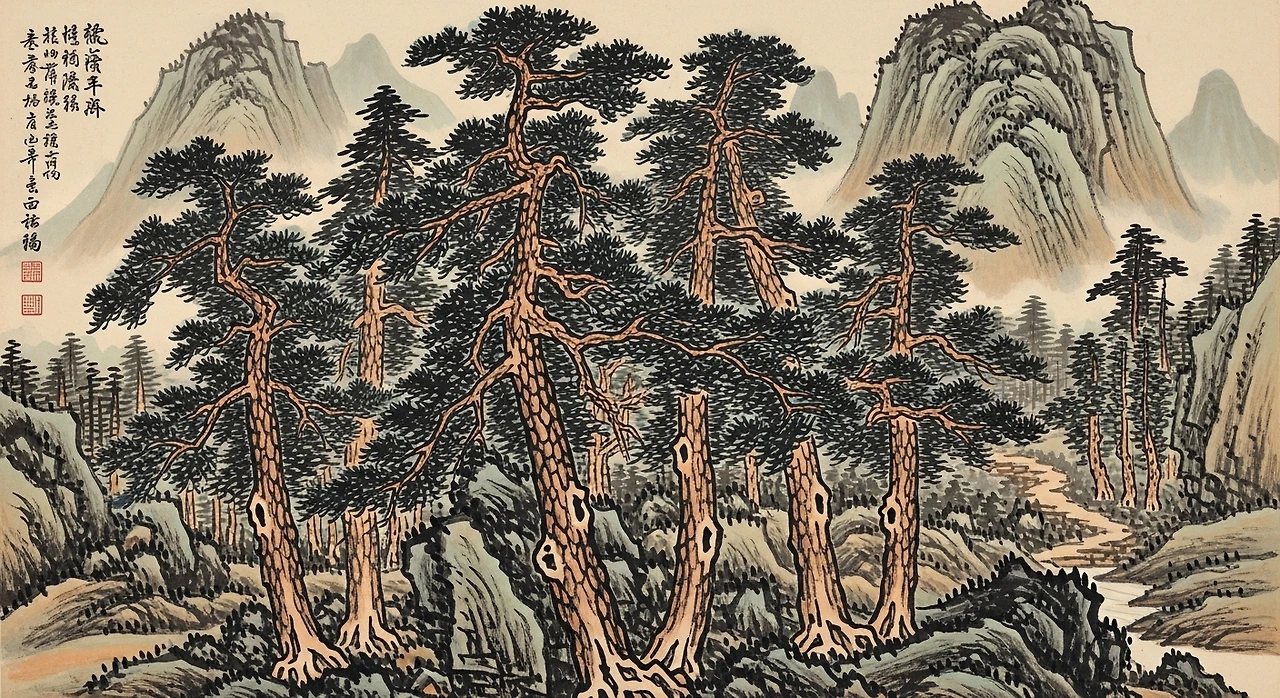 측백나무는 동양화 속에서 자주 등장하는 소재입니다. 굽이진 산맥 사이로 곧게 뻗은 측백나무 한 그루는 흔히 ‘절개와 인내’를 상징합니다.
