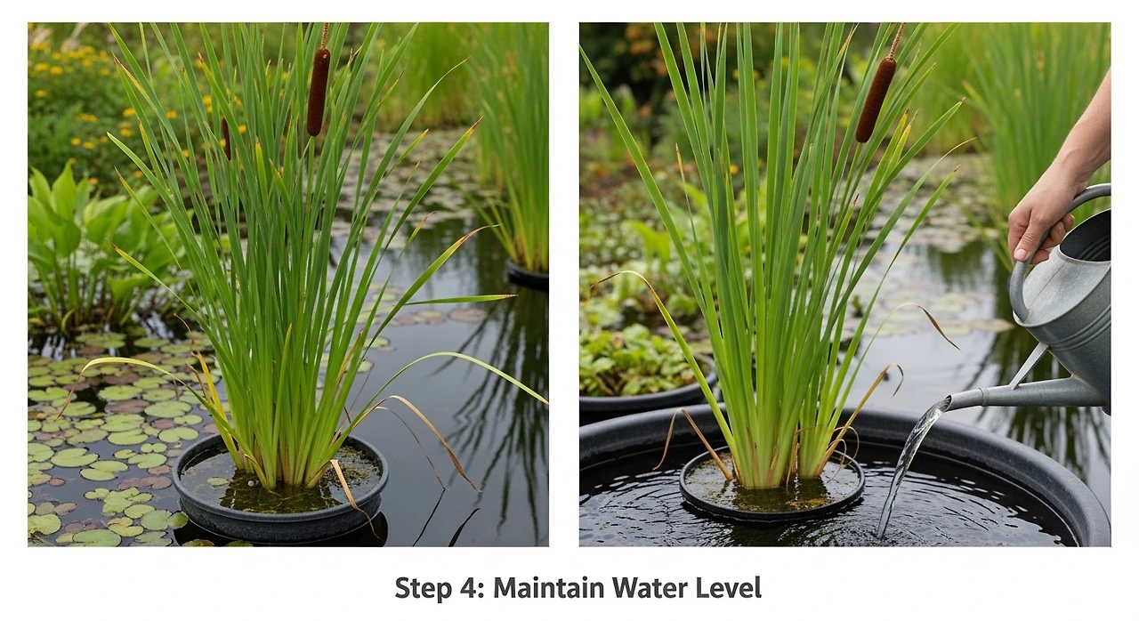 부들은 습지성 식물이므로 연못·수반·수변 정원에서 잘 자랍니다.