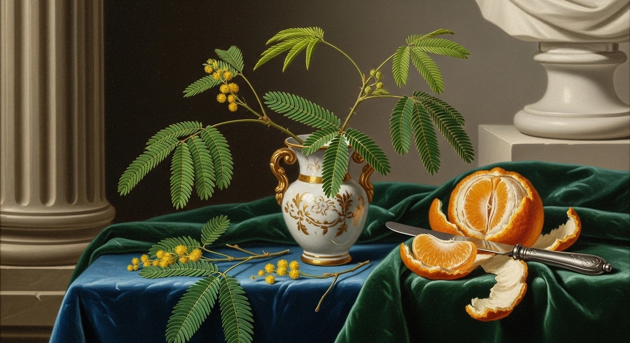 미모사는 ‘섬세한 감정의 식물’이라는 이미지 덕분에 예술 작품 속에서도 종종 등장한다. 프랑스 화가 장 바티스트 모니에의 정물화에서는 조용한 빛 속에 놓인 미모사가 수줍음과 고요함의 정서를 부드럽게 담아내며, 19세기 영국 시인들은 잎을 접는 모습을 ‘감정의 숨결’로 비유하며 여러 시편 속에 기록했다.
