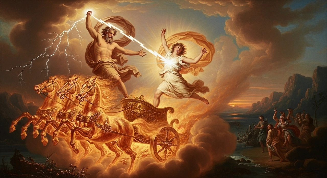 태양신 헬리오스의 아들 파에톤은 아버지의 태양 마차를 직접 몰아보고 싶어 했습니다. 그러나 지나치게 뜨겁고 힘센 말들을 통제하지 못해 세상을 태울 뻔했고, 결국 제우스의 번개를 맞아 에리다누스 강에 떨어져 죽고 말았습니다.
