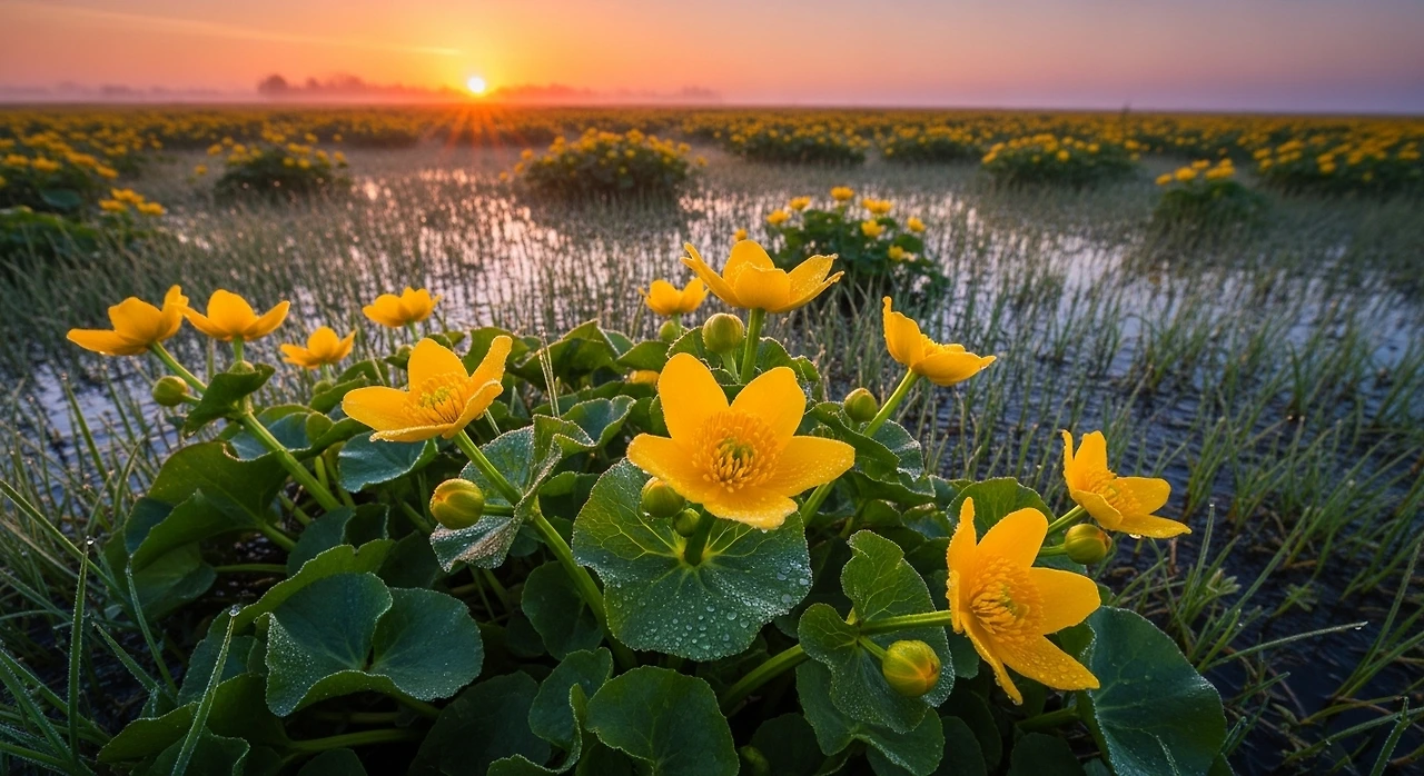 또한 보태니컬 아트에서는 자연광을 받아 반짝이는 이 꽃의 특유의 질감을 표현하는 것이 큰 즐거움으로 여겨져, 18~19세기 식물 도감과 수채화 작품에도 자주 등장합니다. 습지의 고요한 풍경 속에서 환하게 피어오르는 작은 황금빛 포인트는 많은 화가들에게 시간이 지나도 줄지 않는 영감을 주었습니다.