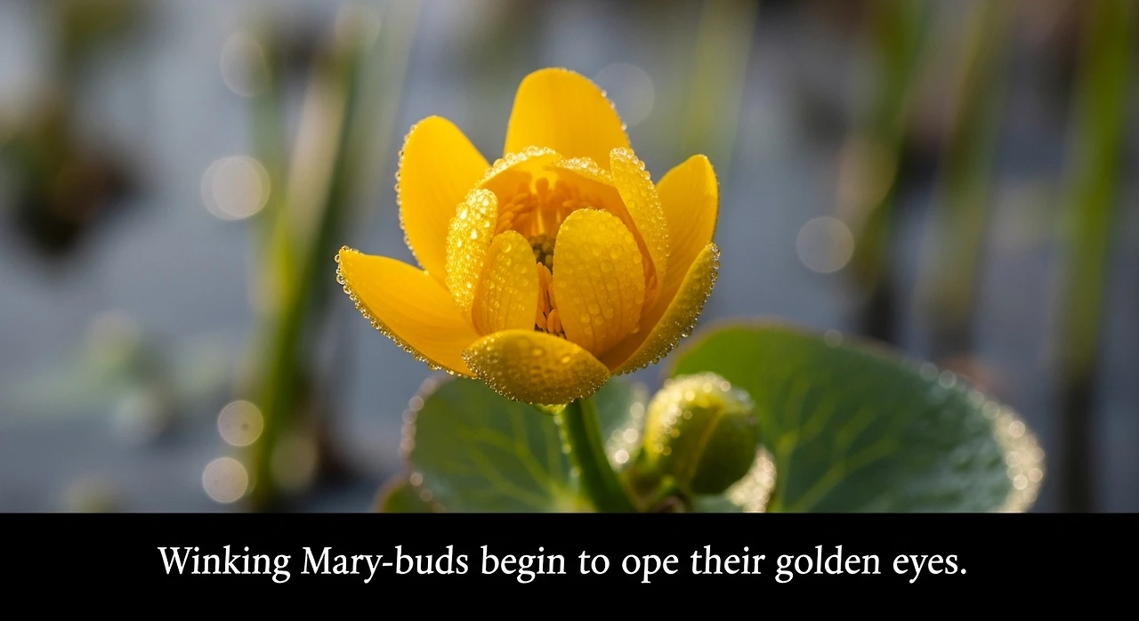 라는 구절이 등장하는데, 여기서 Mary-buds는 바로 Marsh Marigold를 의미합니다. 밤새 접혀 있던 꽃받침이 아침 햇빛을 만나 황금빛 눈을 뜨는 모습을 섬세하게 묘사한 구절입니다.