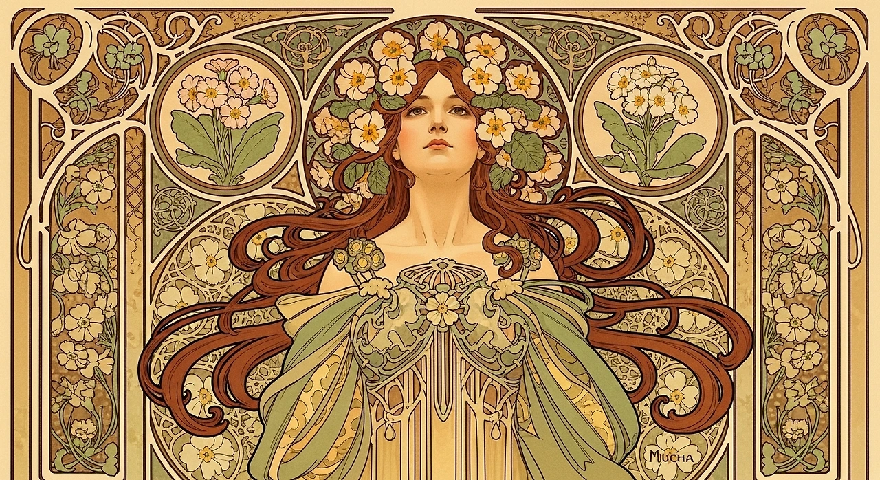 아르누보의 거장 알폰스 무하 역시 앵초를 사랑했습니다. 그의 작품 <Primrose>를 보면, 여성의 우아한 곡선과 앵초 특유의 섬세함이 조화롭습니다. 마치 봄을 한 장의 화면에 오롯이 잡아 두려는 듯한 느낌입니다.