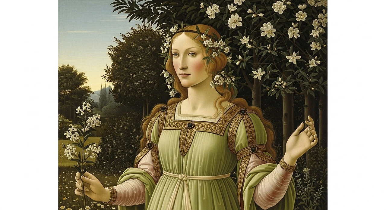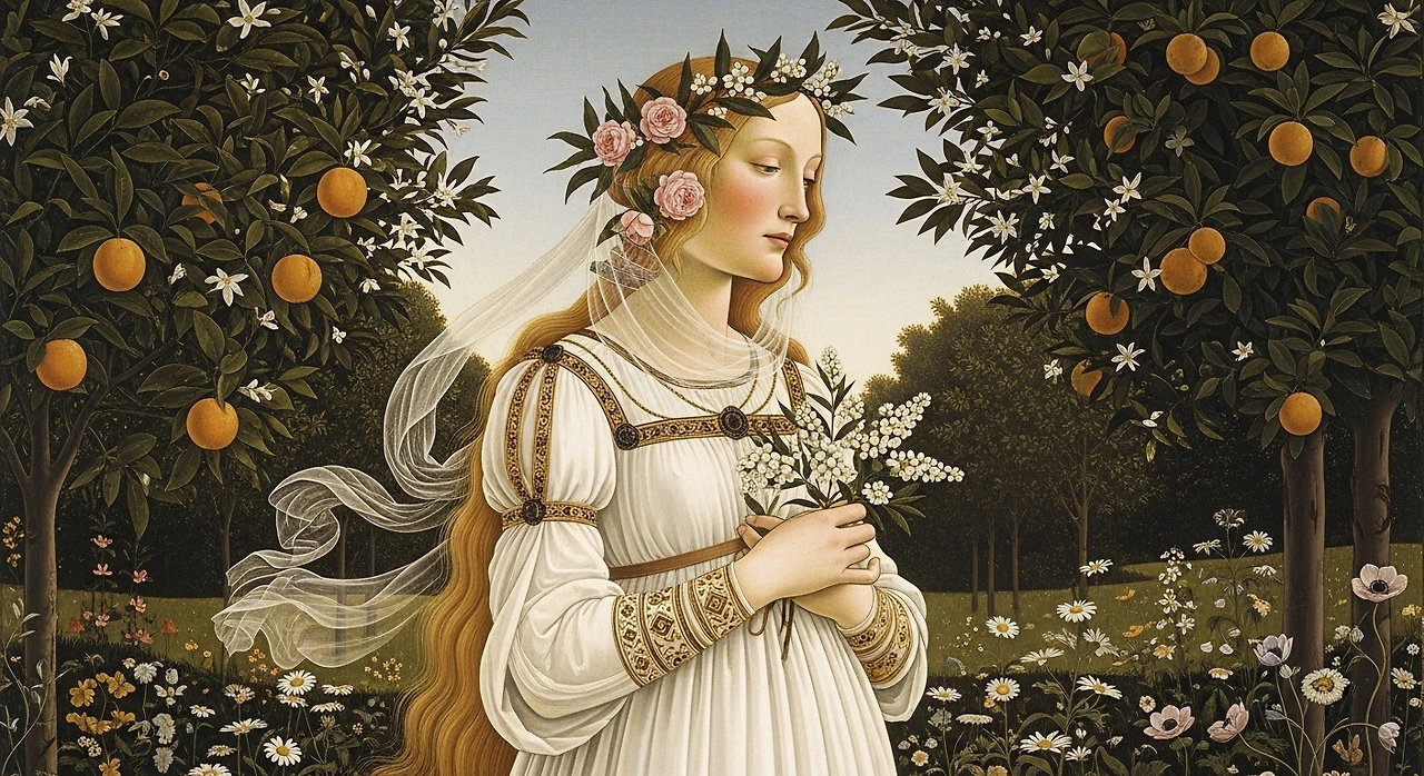 이탈리아 르네상스 화가 산드로 보티첼리(Sandro Botticelli, 1445–1510)의 대표작 ‘프리마베라(Primavera)’에서도 비너스 뒤편을 감싸고 있는 어두운 녹색 덤불이 바로 머틀입니다. 비너스를 둘러싼 식물들 중에서도 머틀은 사랑과 젊음, 결혼을 상징하는 가장 중요한 요소로 읽히며, 그림 전체의 상징체계를 부드럽게 지탱합니다.