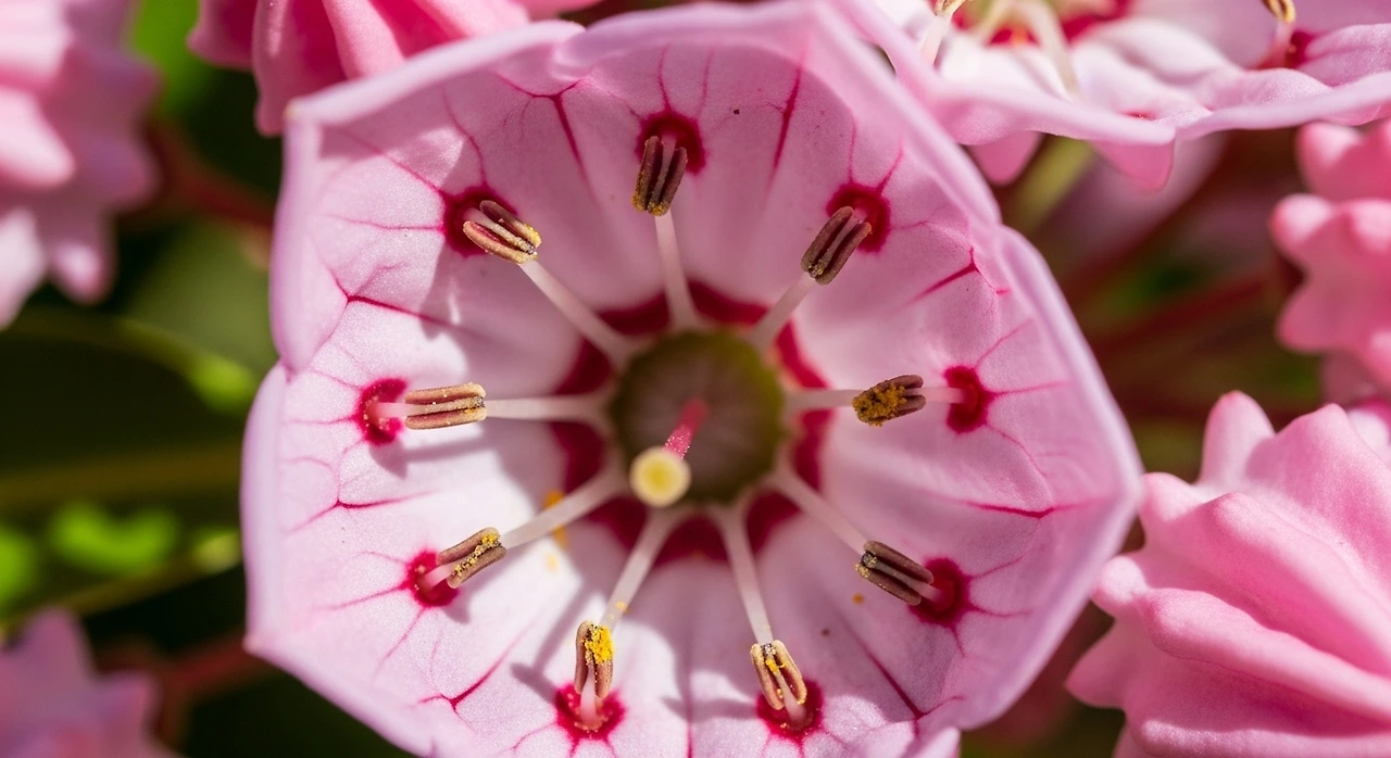 칼미아의 꽃을 조금만 자세히 들여다보면 그 정교함이 놀라울 정도입니다. 오목한 꽃잎 안쪽에는 작은 홈이 파여 있고 수술의 끝이 그 안에 걸려 대기하다가 곤충이 다가오는 순간 탄성으로 튕겨 꽃가루를 퍼뜨립니다. 자연이 만든 작은 스프링 장치이자, 식물 세계에서 보기 드문 독특한 번식 전략입니다.