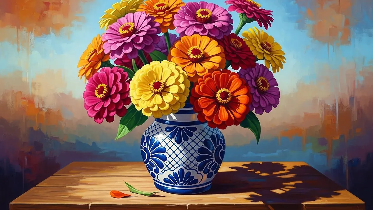 특히 멕시코 근대 화가 판초 피에드라(Pancho Piedra)의 정물화에는 백일홍이 유난히 자주 등장합니다. 단순한 꽃 한 송이를 넘어, 오래 지속되는 사랑과 삶의 인연을 그 자체로 표현하려는 화가의 의도가 묻어납니다. 화병에 꽂힌 진니아는 금방 시들지 않고 당당히 서 있으며, 그림 속에서조차 계절의 흐름에 흔들리지 않는 꽃처럼 그려집니다.