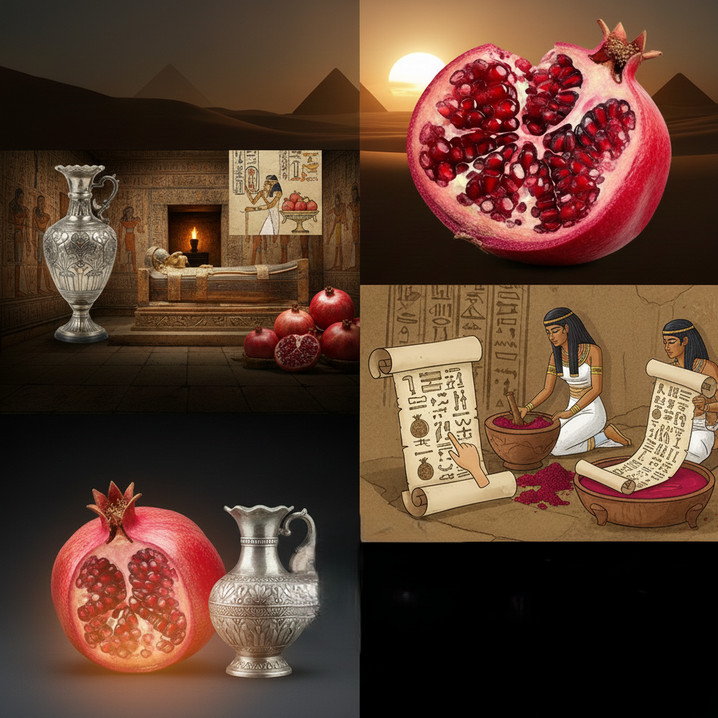 특히 고대 이집트에서는 석류를 영생과 부활의 상징으로 여겨 미라와 함께 무덤에 묻는 부장품으로 사용했습니다. 투탕카멘 왕의 무덤에서 석류 모양의 은제 꽃병이 발견된 것은, 이 열매가 죽은 자의 영혼에 영원한 생명을 약속하는 증표였음을 보여줍니다.