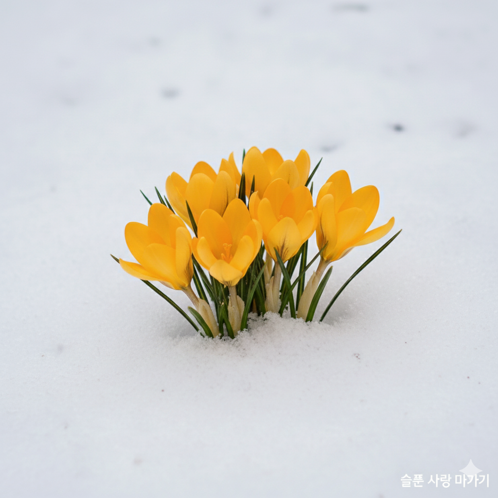 시련을 뚫고 나온 꽃은 향기보다 먼저 그 존재 자체로 우리를 위로합니다. 노란 샤프란의 꽃말처럼, 당신의 청춘도 오늘 이 꽃처럼 찬란하고 후회 없기를 진심으로 응원해 봅니다.