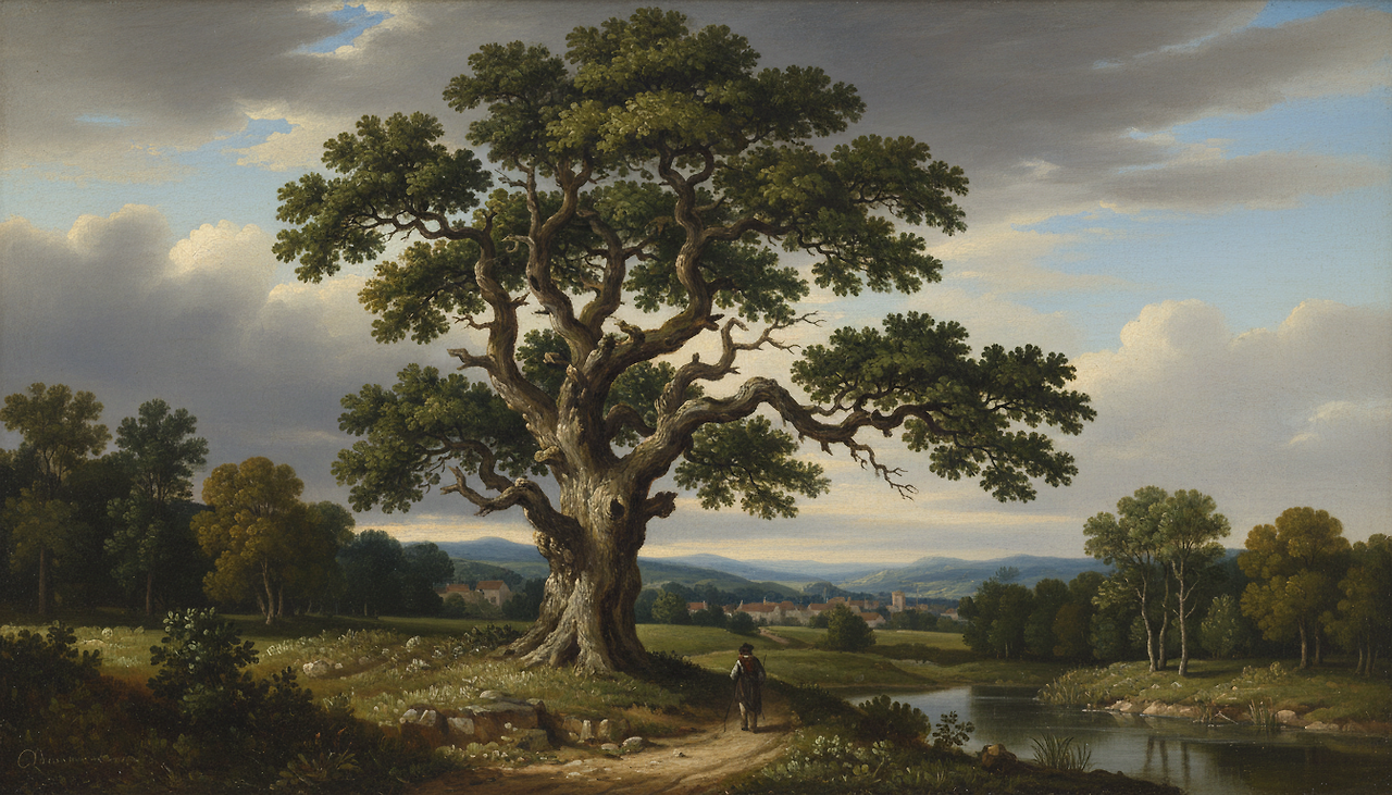 야코프 판 로이스달의 〈폭풍 속의 떡갈나무 The Great Oak〉에서는 폭풍우 속에서도 버티는 떡갈나무가 화면의 중심을 차지합니다. 인간은 작고 연약한 존재로 밀려나고, 떡갈나무는 자연의 권위이자 질서로 등장합니다.