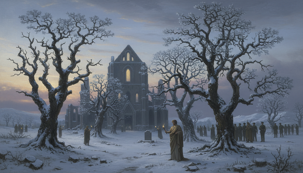 카스파르 다비드 프리드리히의 〈떡갈나무 숲 속의 수도원 Abtei im Eichwald〉에서는 폐허가 된 수도원 옆에 선 떡갈나무들이 인간 문명의 쇠락과 대비되는 자연의 지속성을 상징합니다. 잎을 떨군 나무는 죽음이 아니라, 시간을 초월한 침묵의 증인처럼 서 있습니다.