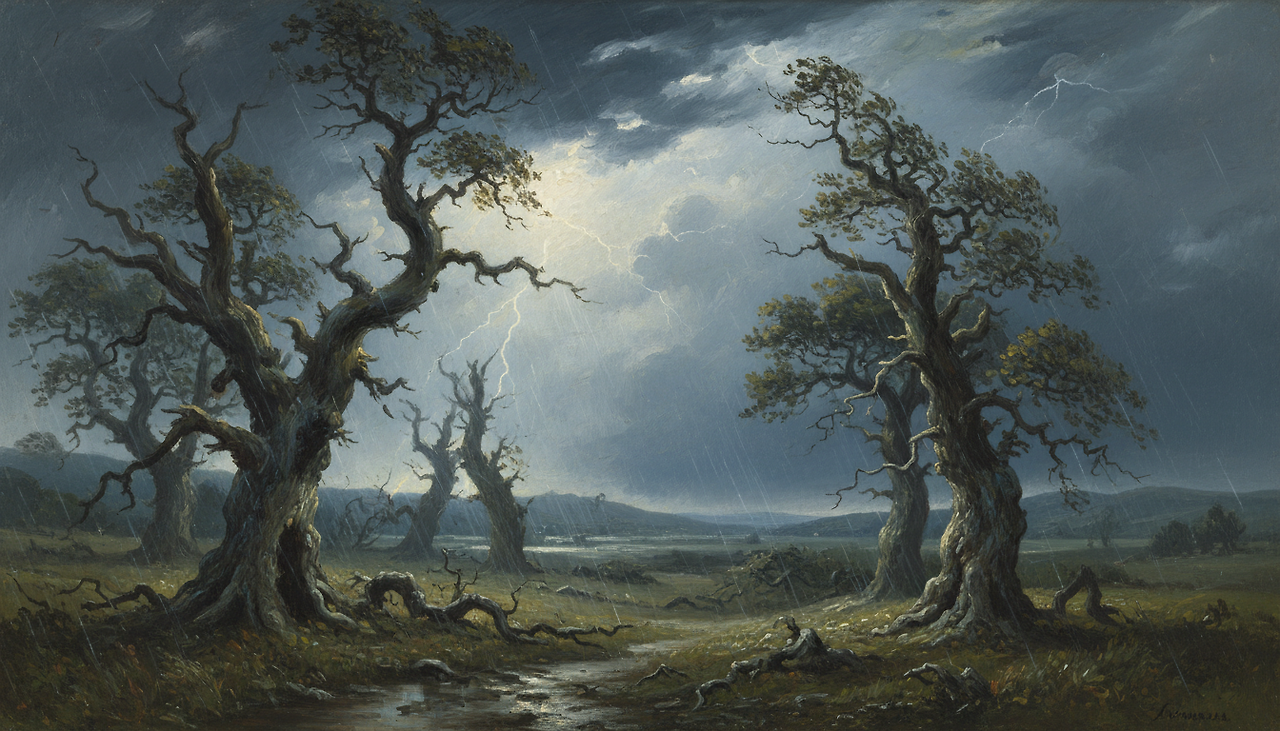 윌리엄 터너의 폭풍우 풍경 속에서도 떡갈나무는 끝까지 중심을 잃지 않습니다. 화면이 요동쳐도 무너지지 않는 나무는 혼란의 시대를 견디는 시간의 기둥처럼 읽힙니다.