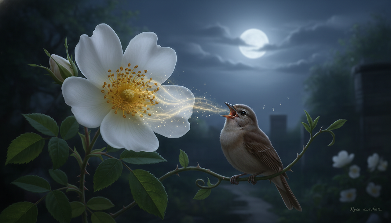 사향장미의 향이 밤에 더 짙어진다는 사실은 이 전설과 묘하게 어울립니다. 사랑은 종종 낮보다 밤에 더 분명해집니다. 고요 속에서야 비로소 들리는 목소리처럼, 사향장미의 향도 어둠 속에서 또렷해집니다.