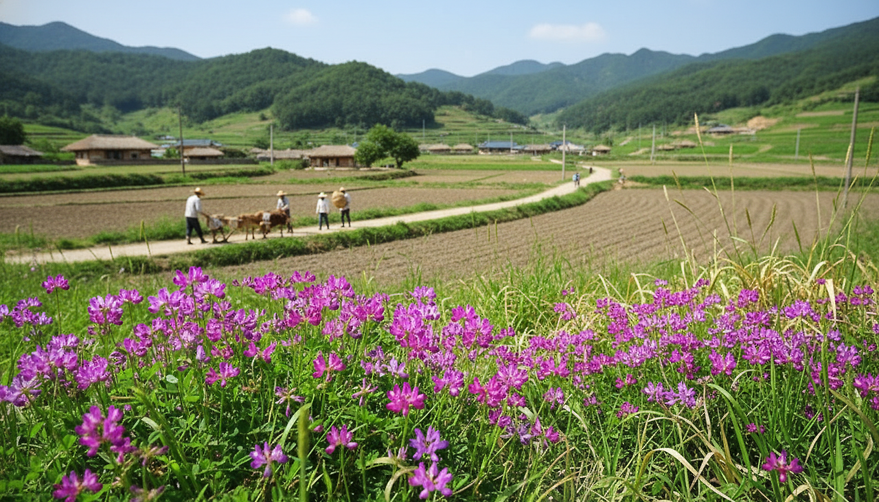 자운영은 화려한 궁정의 꽃은 아니었습니다. 대신 농촌 풍경을 그린 화가들의 화폭 속에서 조용히 제 자리를 지켰습니다. 한국 농촌의 봄 풍경을 담은 여러 민화와 근현대 농촌 풍경화에서, 논을 보랏빛으로 채우는 자운영은 ‘풍요의 전조’로 등장합니다.