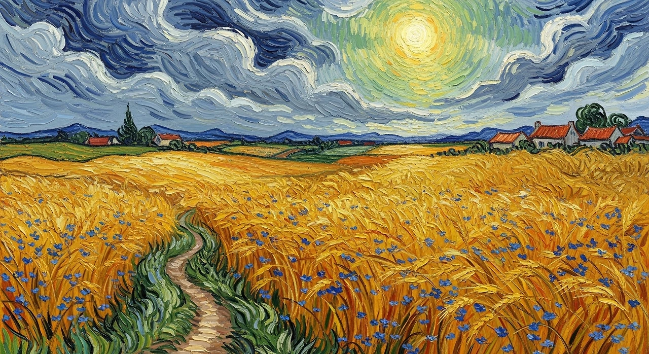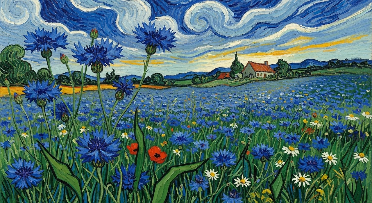 빈센트 반 고흐는 밀밭과 하늘, 그리고 푸른 들꽃을 유난히 사랑했습니다. 그의 밀밭 그림 곳곳에는 작은 푸른 점들이 박혀 있습니다. 그것이 바로 수레국화입니다. 황금빛 밀과 대비되는 선명한 파랑. 생과 죽음, 희망과 고독이 동시에 숨 쉬는 색. 고흐의 파랑은 울트라마린보다도 더 인간적입니다.