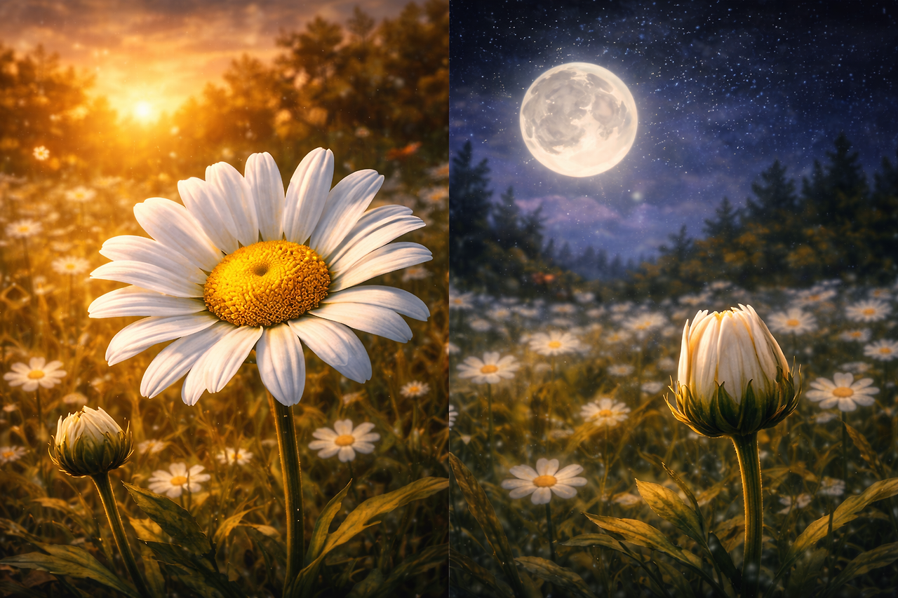 이 단순한 움직임 속에는 하나의 태도가 담겨 있습니다. 피어야 할 때는 주저 없이 피고, 쉴 때는 과감히 닫는 것. 끊임없이 밝기만 한 존재가 아니라, 스스로의 리듬을 아는 존재. 데이지의 꽃말인 희망, 평화, 순수, 명랑은 바로 그 ‘회복력’에서 비롯된 언어입니다.