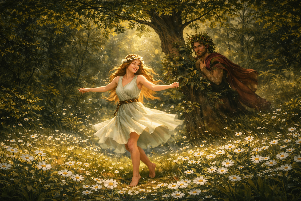 끈질긴 구애가 이어지자 그녀는 점점 두려움과 갈등 속에 빠집니다. 끝내 자신의 사랑과 순결을 지키기 위해 그녀는 신들에게 도움을 청하고, 들판의 작은 흰 꽃으로 변하게 됩니다. 낮에는 태양을 향해 활짝 피고, 밤이 되면 조용히 꽃잎을 닫는 꽃. 그렇게 베리디스는 ‘낮의 눈’이라 불리는 데이지가 되어, 지금도 봄 들판에서 고요히 피어나고 있다고 전해집니다.