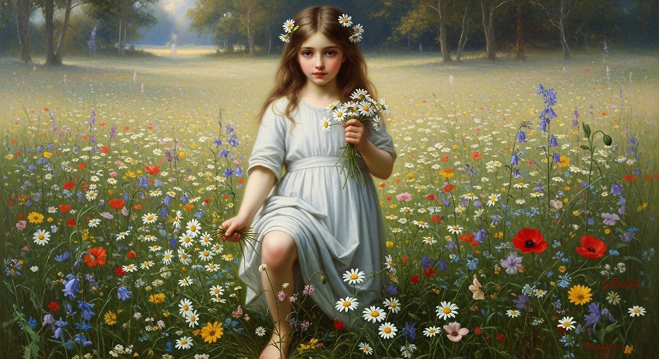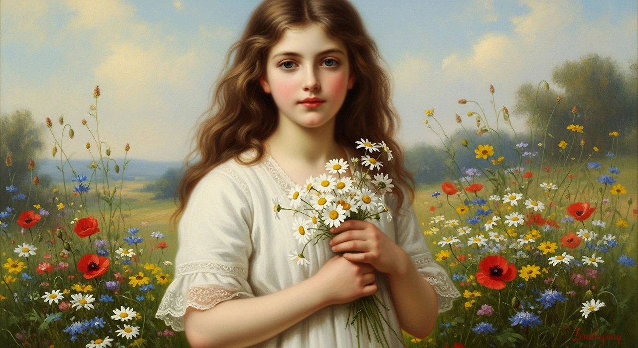 19세기 프랑스 화가 William-Adolphe Bouguereau는 소녀와 들꽃을 자주 그렸습니다. 그의 작품들 속 데이지는 어린 존재의 순수함과 맞닿아 있습니다. 꽃은 장식이 아니라, 인물의 내면을 설명하는 상징이 됩니다.