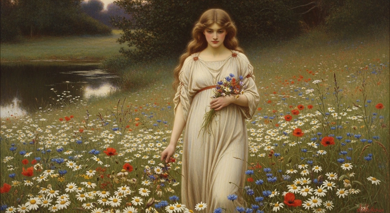 빅토리아 시대의 화가 John William Waterhouse 역시 자연 속 여성 인물을 그릴 때 들꽃을 곁들였습니다. 데이지는 사랑의 점을 치는 ‘He loves me, he loves me not’ 놀이와 함께, 소녀적 감성과 첫사랑의 설렘을 상징하는 꽃으로 자리 잡았습니다.