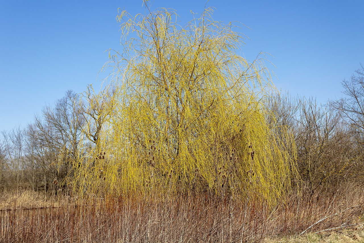 특징: 물가에서 잘 자라며, 가늘고 긴 가지가 아래로 늘어지는 형태. 이른 봄, 연둣빛 새잎이 폭포처럼 흘러내리며 계절의 전환을 알립니다.