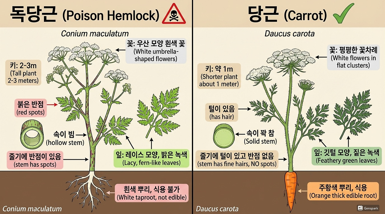 독당근은 야생 당근과 매우 흡사해 위험합니다. 그러나 구별점은 분명합니다.