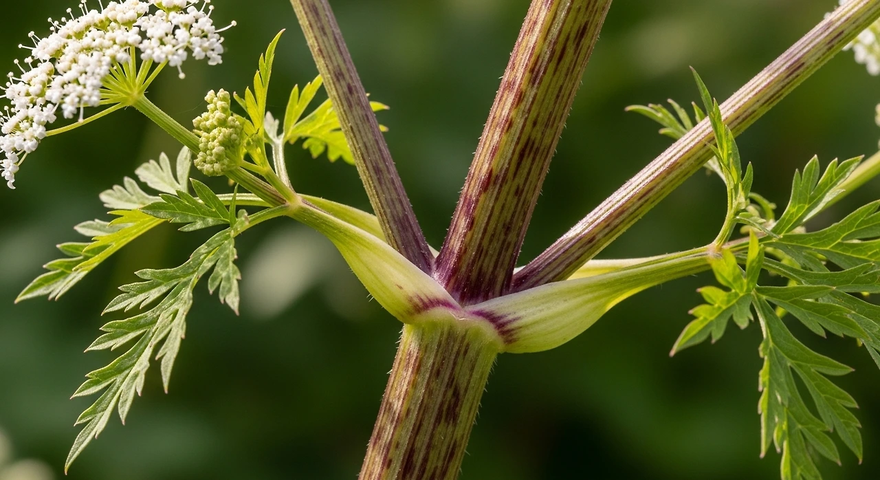 줄기는 매끄럽고 속이 비어 있으며, 무엇보다 붉은색 또는 보라색 반점이 뚜렷합니다. 이 반점이 학명 ‘maculatum(반점이 있는)’의 유래입니다. 잎은 레이스처럼 섬세해 당근과 닮았지만, 식물을 자르면 퀴퀴하고 불쾌한 냄새가 납니다.