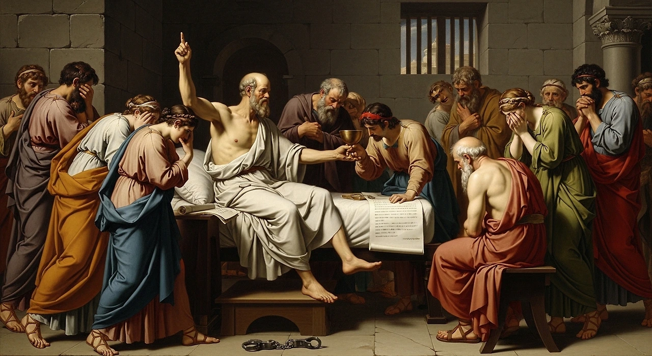 기원전 399년, 그는 젊은이들을 타락시켰다는 혐의로 사형을 선고받습니다. 당시 아테네에서는 독당근으로 만든 독배를 마시는 것이 공식적인 사형 방식이었습니다. 그는 도망칠 기회를 거부하고, 법과 진리에 대한 신념을 지키며 담담히 독을 마셨습니다.