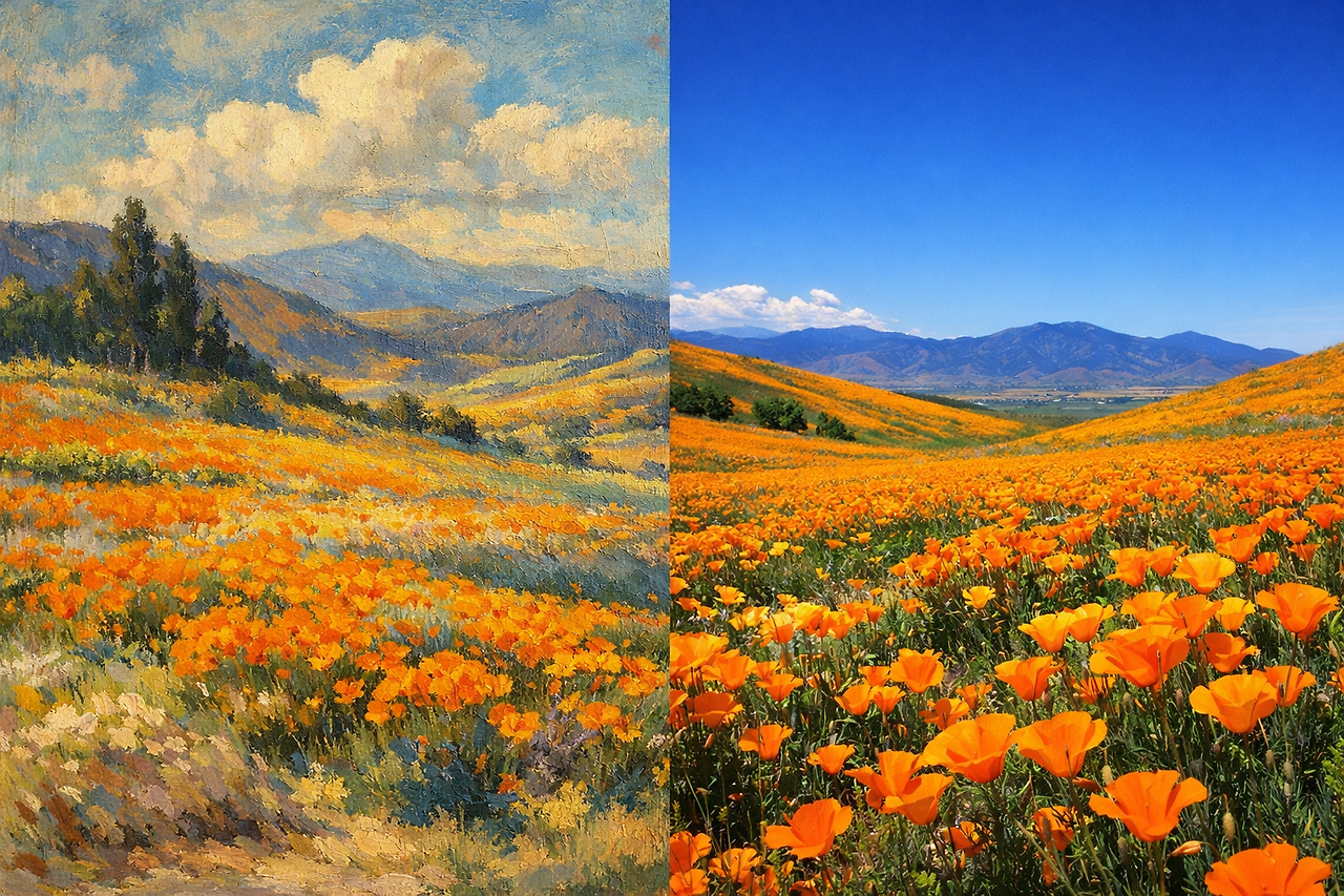 예술가들에게도 이 꽃은 매혹적인 소재였습니다. 캘리포니아 인상주의 화가들은 햇살 아래 피어 있는 금영화 군락을 즐겨 그렸고, 사진가들은 푸른 하늘과 대비되는 주황빛 들판을 통해 ‘서부의 빛’을 표현했습니다. 색채 대비가 분명하고 단순한 구조를 가진 꽃이기에 회화적으로도 아름다운 대상이 됩니다.