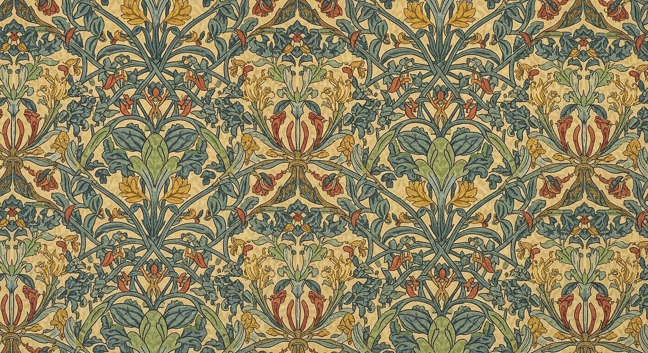 또한 William Morris의 인동덩굴(Honeysuckle) 패턴 디자인은 자연의 반복적 생장 구조를 통해 생명의 순환과 질서를 시각적으로 표현하고 있습니다.