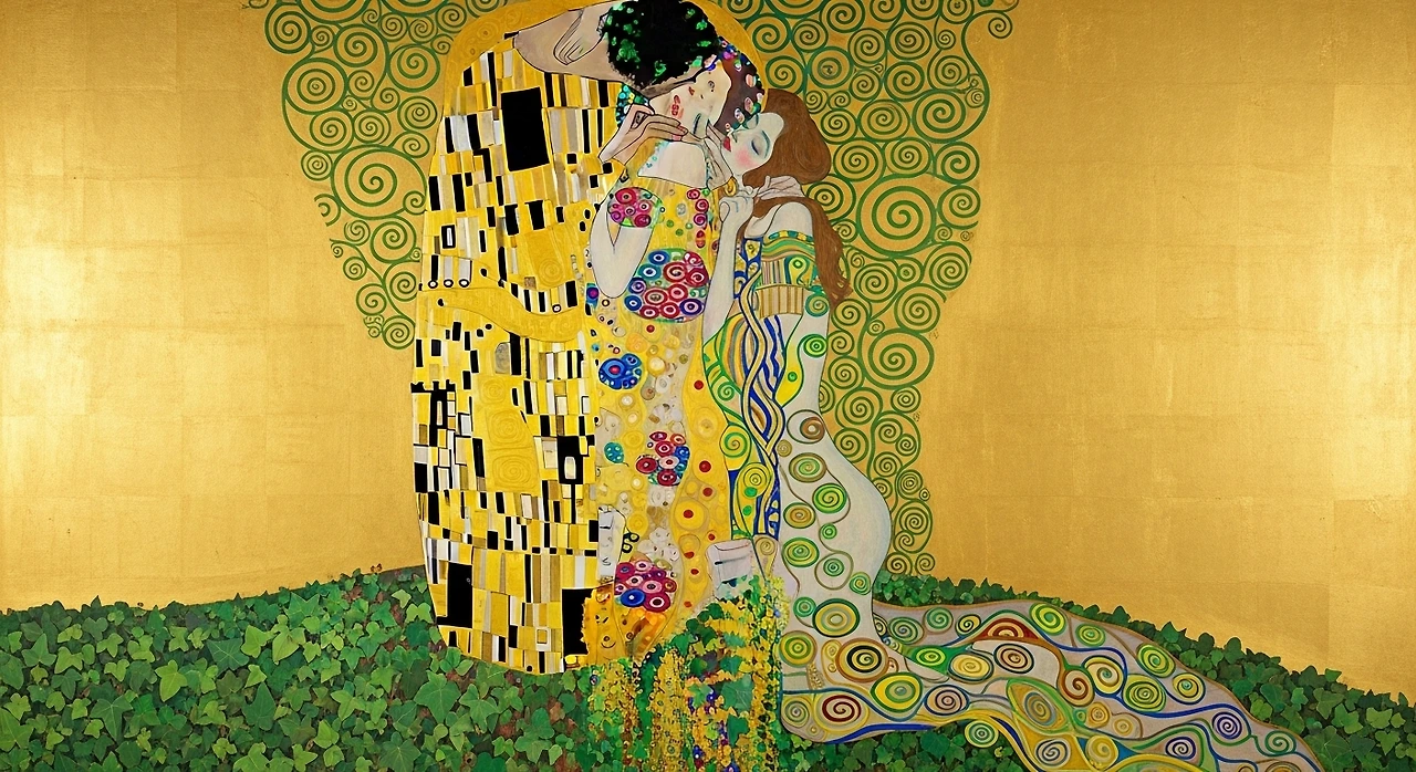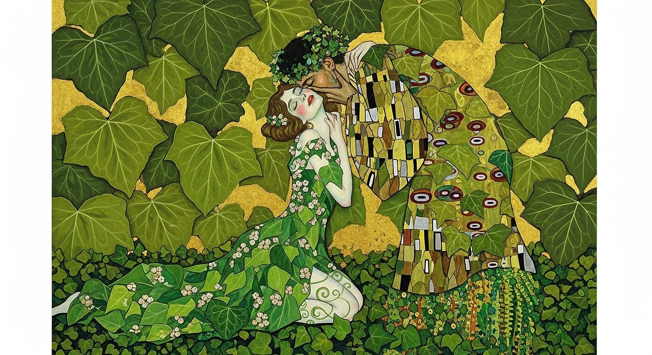 Gustav Klimt의 「키스(The Kiss)」 속 황금빛 배경에는 인물들을 감싸듯 반복되는 담쟁이덩굴 모티프가 등장하는데, 이는 두 존재를 하나로 묶는 생명의 연결을 의미합니다.